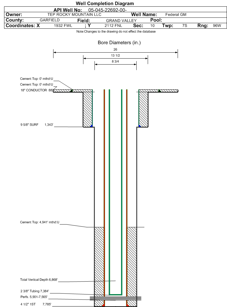 | Wellbore Completed | | Completion Date: | 8/20/2017 | | Spud Date: | 8/17/2017 | Spud Date Is: | ACTUAL | | Measured TD: | 7785 ft. | Measured PB depth: | 7743 ft. | | True Vertical TD: | 6868 ft. | True Vertical PB depth: | 6826 ft. | | Top PZ Location: | Sec:10 Twp: 7S 96W | Footage: 1786 FSL 230 FEL | | Bottom Hole Location: | Sec:10 Twp: 7S 96W | Footage: 1743 FSL 246 FEL | | Log Types: | CBL/PULSED NEUTRON LOG/TRIPLE COMBO IN 045-22704 | | Casing: | String Type: CONDUCTOR, Hole Size: 26 in., Size: 18 in., Top: 0 ft., Depth: 88 ft., Weight: 47.44 , Citings Type: ACTUAL | | Cement: | Sacks: 147, Top: 0 ft., Bottom: 88 ft., Determination Method: VISU | | Casing: | String Type: SURF, Hole Size: 13.5 in., Size: 9.625 in., Top: 0 ft., Depth: 1343 ft., Weight: 32.3 , Citings Type: ACTUAL | | Cement: | Sacks: 325, Top: 0 ft., Bottom: 1343 ft., Determination Method: VISU | | Casing: | String Type: 1ST, Hole Size: 8.75 in., Size: 4.5 in., Top: 0 ft., Depth: 7785 ft., Weight: 11.6 , Citings Type: ACTUAL | | Cement: | Sacks: 850, Top: 4941 ft., Bottom: 7785 ft., Determination Method: CBL | | Formation | Interval Top | Log Bottom | Cored | DSTs | | WASATCH G | 2453 ft. | | | | | MESAVERDE | 4624 ft. | | | | | OHIO CREEK | 4624 ft. | | | | | WILLIAMS FORK | 4830 ft. | | | | | CAMEO | 7353 ft. | | | | | ROLLINS | 7640 ft. | | | |