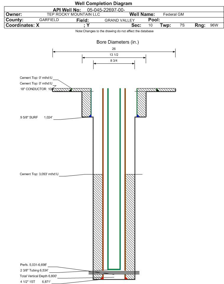 Wellbore #00 Wellbore Classification: GW Status: PR - 11/20/2017 Measured TD: 6871 ft. Vertical TD: 6800 ft.| Wellbore Data for Original Wellbore | Wellbore Classification: GW PR - 11/20/2017 | | Wellbore Permit | DIRECTIONAL | | Permit #: | | Expiration Date: | 12/11/2018 | | Proposed Top PZ Location: | Sec:10 Twp: 7S 96W | Footage: 1431 FNL 2389 FWL | | Bottom Hole Location: | Sec:10 Twp: 7S 96W | Footage: 1431 FNL 2389 FWL | | Proposed Depth/Form: | 6900 ft. | | Surface Mineral Owner Same: | No | | Mineral Owner: | FEDERAL | Surface Owner: | FEDERAL | | Unit: | | Unit Number: | | | Formation And Spacing: | Code: WMFK , Formation: WILLIAMS FORK , Order: 510-9 , Unit Acreage: , Drill Unit: | | Casing: | String Type: CONDUCTOR, Hole Size: 26 in., Size: 18 in., Top: 0 ft., Depth: 80 ft., Weight: 48 , Citings Type: PLANNED | | Cement: | Sacks: 35, Top: 0 ft., Bottom: 80 ft. | | Casing: | String Type: SURF, Hole Size: 13.5 in., Size: 9.625 in., Top: 0 ft., Depth: 1000 ft., Weight: 32.3 , Citings Type: PLANNED | | Cement: | Sacks: 244, Top: 0 ft., Bottom: 1000 ft. | | Casing: | String Type: 1ST, Hole Size: 8.75 in., Size: 4.5 in., Top: 0 ft., Depth: 6900 ft., Weight: 11.6 , Citings Type: PLANNED | | Cement: | Sacks: 596, Top: 3551 ft., Bottom: 6900 ft. |