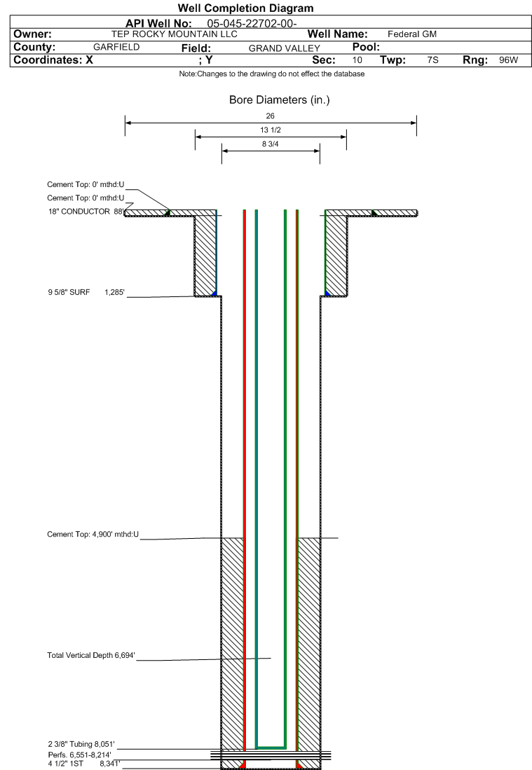 Wellbore #00 Wellbore Classification: GW Status: PR - 8/10/2017 Measured TD: 8341 ft. Vertical TD: 6694 ft.| Wellbore Data for Original Wellbore | Wellbore Classification: GW PR - 8/10/2017 | | Wellbore Permit | DIRECTIONAL | | Permit #: | | Expiration Date: | 12/11/2018 | | Proposed Top PZ Location: | Sec:9 Twp: 7S 96W | Footage: 233 FNL 1548 FEL | | Bottom Hole Location: | Sec:9 Twp: 7S 96W | Footage: 233 FNL 1548 FEL | | Proposed Depth/Form: | 7195 ft. | | Surface Mineral Owner Same: | No | | Mineral Owner: | FEDERAL | Surface Owner: | FEDERAL | | Unit: | | Unit Number: | | | Formation And Spacing: | Code: WMFK , Formation: WILLIAMS FORK , Order: 510-9 , Unit Acreage: , Drill Unit: | | Casing: | String Type: CONDUCTOR, Hole Size: 26 in., Size: 18 in., Top: 0 ft., Depth: 80 ft., Weight: 48 , Citings Type: PLANNED | | Cement: | Sacks: 35, Top: 0 ft., Bottom: 80 ft. | | Casing: | String Type: SURF, Hole Size: 13.5 in., Size: 9.625 in., Top: 0 ft., Depth: 1232 ft., Weight: 32.3 , Citings Type: PLANNED | | Cement: | Sacks: 296, Top: 0 ft., Bottom: 1232 ft. | | Casing: | String Type: 1ST, Hole Size: 8.75 in., Size: 4.5 in., Top: 0 ft., Depth: 8351 ft., Weight: 11.6 , Citings Type: PLANNED | | Cement: | Sacks: 605, Top: 4949 ft., Bottom: 8351 ft. |