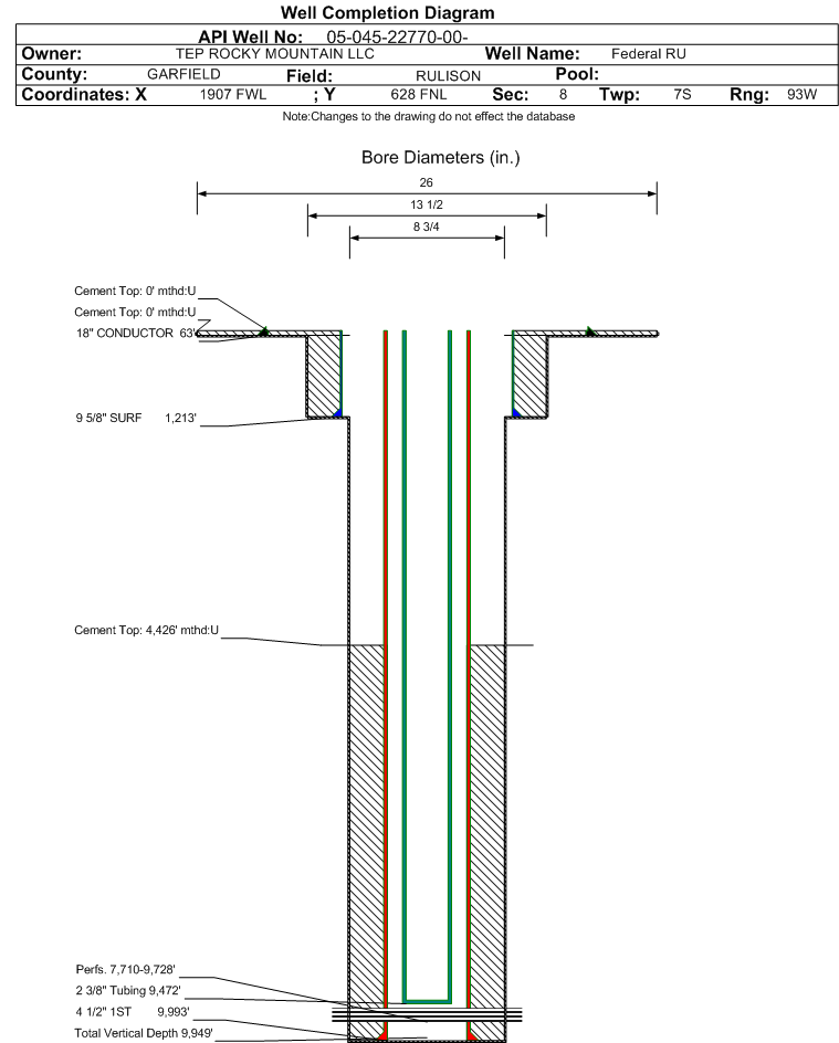 | Wellbore Completed | | Completion Date: | 2/9/2016 | | Spud Date: | 2/3/2016 | Spud Date Is: | ACTUAL | | Measured TD: | 10000 ft. | Measured PB depth: | 9957 ft. | | True Vertical TD: | 9949 ft. | True Vertical PB depth: | 9906 ft. | | Top PZ Location: | Sec:8 Twp: 7S 93W | Footage: 481 FNL 2460 FEL | | Bottom Hole Location: | Sec:8 Twp: 7S 93W | Footage: 525 FNL 2657 FEL | | Log Types: | RPM/MUD/CBL/Triple Combo on 045-22773 | | Casing: | String Type: CONDUCTOR, Hole Size: 26 in., Size: 18 in., Top: 0 ft., Depth: 63 ft., Weight: 47.4 , Citings Type: ACTUAL | | Cement: | Sacks: 24, Top: 0 ft., Bottom: 63 ft., Determination Method: VISU | | Casing: | String Type: SURF, Hole Size: 13.5 in., Size: 9.625 in., Top: 0 ft., Depth: 1213 ft., Weight: 32.3 , Citings Type: ACTUAL | | Cement: | Sacks: 345, Top: 0 ft., Bottom: 1213 ft., Determination Method: VISU | | Casing: | String Type: 1ST, Hole Size: 8.75 in., Size: 4.5 in., Top: 0 ft., Depth: 9993 ft., Weight: 11.6 , Citings Type: ACTUAL | | Cement: | Sacks: 1075, Top: 4426 ft., Bottom: 9993 ft., Determination Method: CBL | | Formation | Interval Top | Log Bottom | Cored | DSTs | | WASATCH G | 3713 ft. | | | | | MESAVERDE | 6232 ft. | | | | | WILLIAMS FORK | 6232 ft. | | | | | CAMEO | 9055 ft. | | | | | ROLLINS | 9853 ft. | | | |