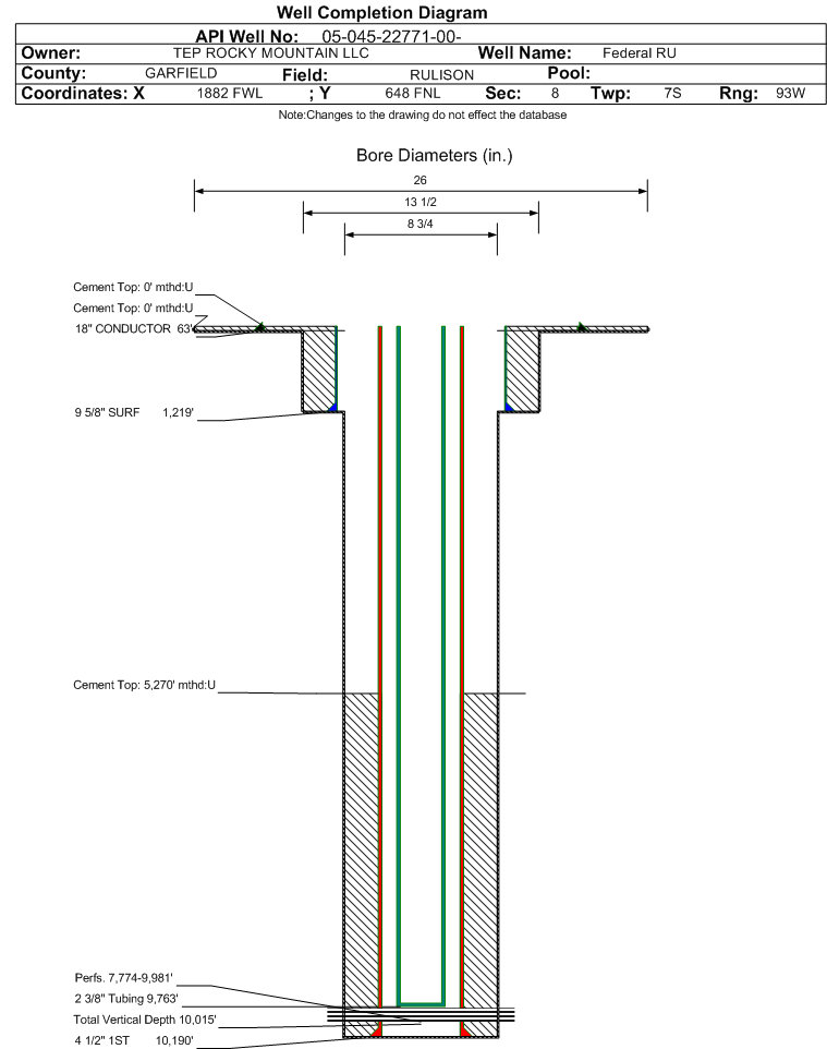 | Wellbore Completed | | Completion Date: | 1/27/2016 | | Spud Date: | 1/20/2016 | Spud Date Is: | ACTUAL | | Measured TD: | 10200 ft. | Measured PB depth: | 10160 ft. | | True Vertical TD: | 10015 ft. | True Vertical PB depth: | 9975 ft. | | Top PZ Location: | Sec:5 Twp: 7S 93W | Footage: 188 FSL 679 FWL | | Bottom Hole Location: | Sec:5 Twp: 7S 93W | Footage: 132 FSL 647 FWL | | Log Types: | RPM/MUD/CBL/Triple Combo on 045-22773 | | Casing: | String Type: CONDUCTOR, Hole Size: 26 in., Size: 18 in., Top: 0 ft., Depth: 63 ft., Weight: 47.4 , Citings Type: ACTUAL | | Cement: | Sacks: 24, Top: 0 ft., Bottom: 63 ft., Determination Method: VISU | | Casing: | String Type: SURF, Hole Size: 13.5 in., Size: 9.625 in., Top: 0 ft., Depth: 1219 ft., Weight: 32.3 , Citings Type: ACTUAL | | Cement: | Sacks: 325, Top: 0 ft., Bottom: 1219 ft., Determination Method: VISU | | Casing: | String Type: 1ST, Hole Size: 8.75 in., Size: 4.5 in., Top: 0 ft., Depth: 10190 ft., Weight: 11.6 , Citings Type: ACTUAL | | Cement: | Sacks: 1025, Top: 5270 ft., Bottom: 10190 ft., Determination Method: CBL | | Formation | Interval Top | Log Bottom | Cored | DSTs | | WASATCH G | 3800 ft. | | | | | MESAVERDE | 6277 ft. | | | | | WILLIAMS FORK | 6277 ft. | | | | | CAMEO | 9214 ft. | | | | | ROLLINS | 10019 ft. | | | |