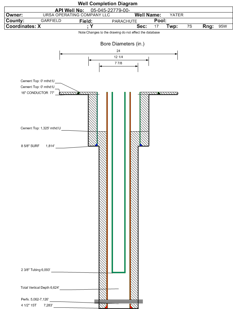 Wellbore #00 Wellbore Classification: GW Status: PR - 11/6/2015 Measured TD: 7297 ft. Vertical TD: 6624 ft.| Wellbore Data for Original Wellbore | Wellbore Classification: GW PR - 11/6/2015 | | Wellbore Permit | DIRECTIONAL | | Permit #: | | Expiration Date: | 1/14/2017 | | Proposed Top PZ Location: | Sec:17 Twp: 7S 95W | Footage: 1381 FNL 660 FWL | | Bottom Hole Location: | Sec:17 Twp: 7S 95W | Footage: 1381 FSL 660 FWL | | Proposed Depth/Form: | 7333 ft. | | Surface Mineral Owner Same: | No | | Mineral Owner: | FEE | Surface Owner: | FEE | | Unit: | | Unit Number: | | | Formation And Spacing: | Code: WMFK , Formation: WILLIAMS FORK , Order: 440-58 , Unit Acreage: 240, Drill Unit: Sec 17 NW, W/2NE | | Casing: | String Type: CONDUCTOR, Hole Size: 24 in., Size: 16 in., Top: 0 ft., Depth: 60 ft., Weight: 84 , Citings Type: PLANNED | | Cement: | Sacks: 111, Top: 0 ft., Bottom: 60 ft. | | Casing: | String Type: SURF, Hole Size: 12.25 in., Size: 8.625 in., Top: 0 ft., Depth: 1844 ft., Weight: 32 , Citings Type: PLANNED | | Cement: | Sacks: 381, Top: 0 ft., Bottom: 1844 ft. | | Casing: | String Type: 1ST, Hole Size: 7.875 in., Size: 4.5 in., Top: 0 ft., Depth: 7333 ft., Weight: 11.6 , Citings Type: PLANNED | | Cement: | Sacks: 484, Top: , Bottom: 7333 ft. |