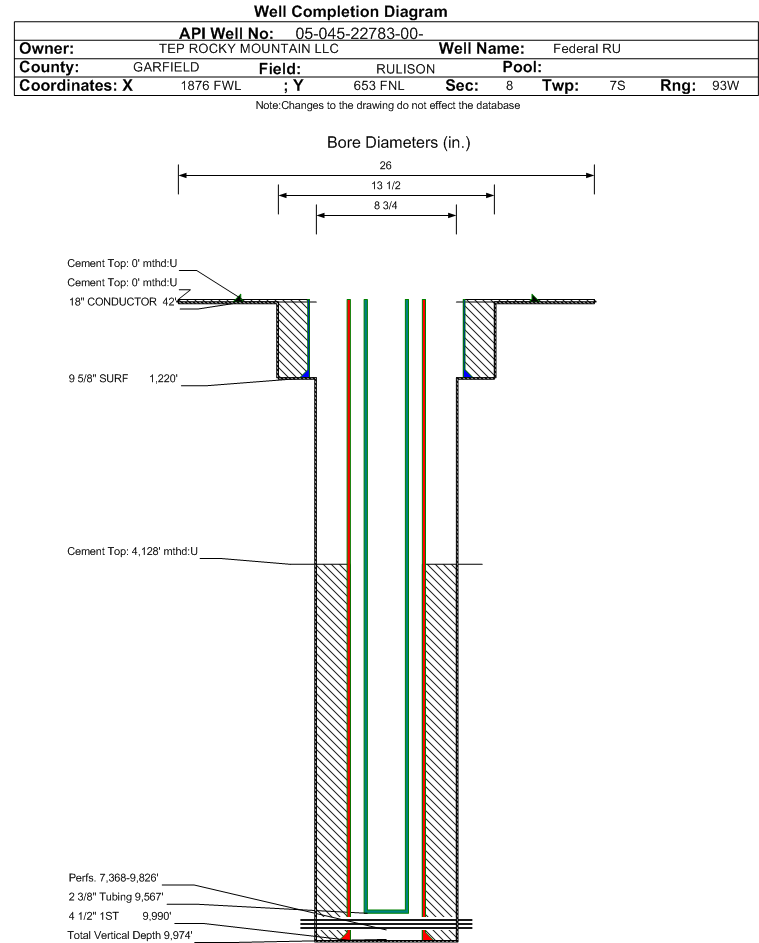 | Wellbore Completed | | Completion Date: | 11/26/2015 | | Spud Date: | 11/19/2015 | Spud Date Is: | ACTUAL | | Measured TD: | 10000 ft. | Measured PB depth: | 9964 ft. | | True Vertical TD: | 9974 ft. | True Vertical PB depth: | 9938 ft. | | Top PZ Location: | Sec:8 Twp: 7S 93W | Footage: 603 FNL 1462 FWL | | Bottom Hole Location: | Sec:8 Twp: 7S 93W | Footage: 645 FNL 1459 FWL | | Log Types: | CBL/MUD/Triple Combo | | Casing: | String Type: CONDUCTOR, Hole Size: 26 in., Size: 18 in., Top: 0 ft., Depth: 42 ft., Weight: 47.4 , Citings Type: ACTUAL | | Cement: | Sacks: 16, Top: 0 ft., Bottom: 42 ft., Determination Method: VISU | | Casing: | String Type: SURF, Hole Size: 13.5 in., Size: 9.625 in., Top: 0 ft., Depth: 1220 ft., Weight: 32.3 , Citings Type: ACTUAL | | Cement: | Sacks: 325, Top: 0 ft., Bottom: 1220 ft., Determination Method: VISU | | Casing: | String Type: 1ST, Hole Size: 8.75 in., Size: 4.5 in., Top: 0 ft., Depth: 9990 ft., Weight: 11.6 , Citings Type: ACTUAL | | Cement: | Sacks: 1080, Top: 4128 ft., Bottom: 9990 ft., Determination Method: CBL | | Formation | Interval Top | Log Bottom | Cored | DSTs | | WASATCH G | 3718 ft. | | | | | MESAVERDE | 6190 ft. | | | | | WILLIAMS FORK | 6190 ft. | | | | | CAMEO | 9022 ft. | | | | | ROLLINS | 9847 ft. | | | |