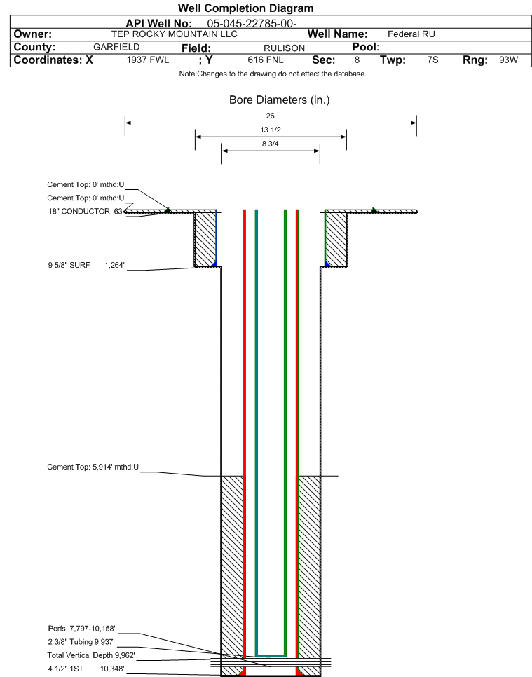 | Wellbore Completed | | Completion Date: | 11/10/2015 | | Spud Date: | 11/3/2015 | Spud Date Is: | ACTUAL | | Measured TD: | 10360 ft. | Measured PB depth: | 10316 ft. | | True Vertical TD: | 9962 ft. | True Vertical PB depth: | 9918 ft. | | Top PZ Location: | Sec:5 Twp: 7S 93W | Footage: 294 FSL 1254 FEL | | Bottom Hole Location: | Sec:5 Twp: 7S 93W | Footage: 238 FSL 1267 FEL | | Log Types: | RPM/MUD/CBL/Triple Combo on 045-22773 | | Casing: | String Type: CONDUCTOR, Hole Size: 26 in., Size: 18 in., Top: 0 ft., Depth: 63 ft., Weight: 47.4 , Citings Type: ACTUAL | | Cement: | Sacks: 24, Top: 0 ft., Bottom: 63 ft., Determination Method: VISU | | Casing: | String Type: SURF, Hole Size: 13.5 in., Size: 9.625 in., Top: 0 ft., Depth: 1264 ft., Weight: 32.3 , Citings Type: ACTUAL | | Cement: | Sacks: 320, Top: 0 ft., Bottom: 1264 ft., Determination Method: VISU | | Casing: | String Type: 1ST, Hole Size: 8.75 in., Size: 4.5 in., Top: 0 ft., Depth: 10348 ft., Weight: 11.6 , Citings Type: ACTUAL | | Cement: | Sacks: 855, Top: 5914 ft., Bottom: 10348 ft., Determination Method: CBL | | Formation | Interval Top | Log Bottom | Cored | DSTs | | WASATCH G | 3922 ft. | | | | | MESAVERDE | 6593 ft. | | | | | WILLIAMS FORK | 6593 ft. | | | | | CAMEO | 9495 ft. | | | | | ROLLINS | 10241 ft. | | | |