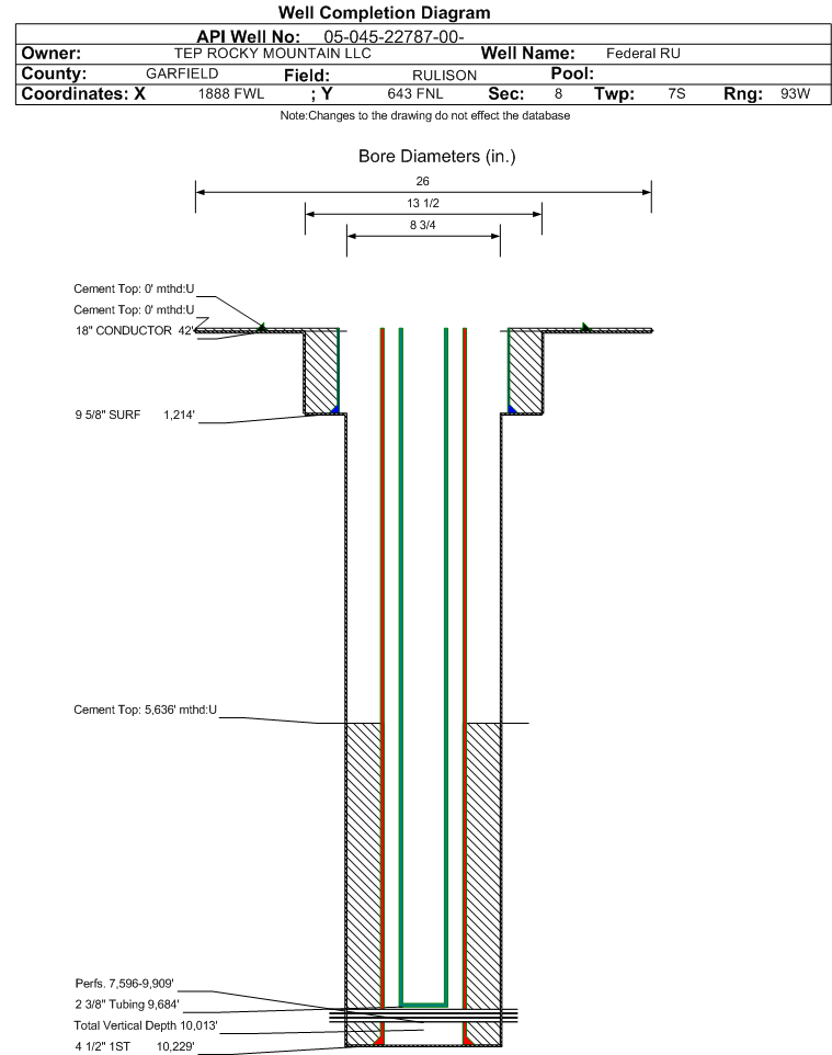 | Wellbore Completed | | Completion Date: | 12/4/2015 | | Spud Date: | 11/26/2015 | Spud Date Is: | ACTUAL | | Measured TD: | 10239 ft. | Measured PB depth: | 10198 ft. | | True Vertical TD: | 10013 ft. | True Vertical PB depth: | 9972 ft. | | Top PZ Location: | Sec:5 Twp: 7S 93W | Footage: 504 FSL 688 FWL | | Bottom Hole Location: | Sec:5 Twp: 7S 93W | Footage: 463 FSL 655 FWL | | Log Types: | RPM/MUD/CBL/Triple Combo on 045-22773 | | Casing: | String Type: CONDUCTOR, Hole Size: 26 in., Size: 18 in., Top: 0 ft., Depth: 42 ft., Weight: 47.4 , Citings Type: ACTUAL | | Cement: | Sacks: 16, Top: 0 ft., Bottom: 42 ft., Determination Method: VISU | | Casing: | String Type: SURF, Hole Size: 13.5 in., Size: 9.625 in., Top: 0 ft., Depth: 1214 ft., Weight: 32.3 , Citings Type: ACTUAL | | Cement: | Sacks: 325, Top: 0 ft., Bottom: 1214 ft., Determination Method: VISU | | Casing: | String Type: 1ST, Hole Size: 8.75 in., Size: 4.5 in., Top: 0 ft., Depth: 10229 ft., Weight: 11.6 , Citings Type: ACTUAL | | Cement: | Sacks: 1070, Top: 5636 ft., Bottom: 10229 ft., Determination Method: CBL | | Formation | Interval Top | Log Bottom | Cored | DSTs | | WASATCH G | 3813 ft. | | | | | MESAVERDE | 6392 ft. | | | | | WILLIAMS FORK | 6392 ft. | | | | | CAMEO | 9271 ft. | | | | | ROLLINS | 10058 ft. | | | |