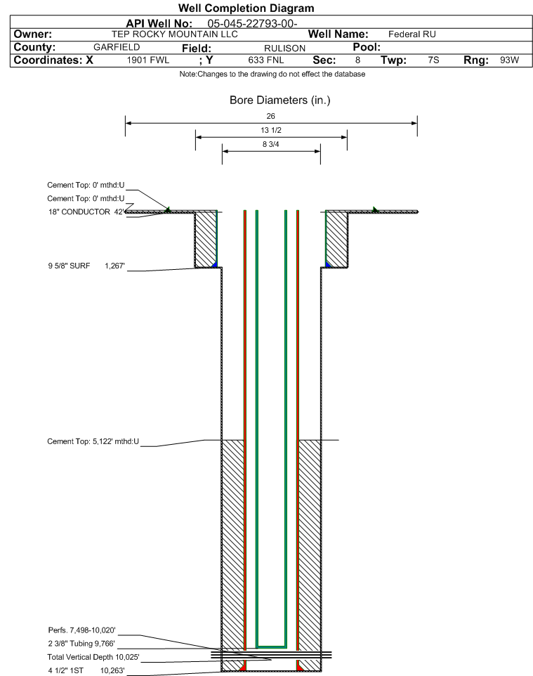 | Wellbore Completed | | Completion Date: | 12/12/2015 | | Spud Date: | 12/5/2015 | Spud Date Is: | ACTUAL | | Measured TD: | 10273 ft. | Measured PB depth: | 10233 ft. | | True Vertical TD: | 10025 ft. | True Vertical PB depth: | 9985 ft. | | Top PZ Location: | Sec:5 Twp: 7S 93W | Footage: 807 FSL 992 FWL | | Bottom Hole Location: | Sec:5 Twp: 7S 93W | Footage: 758 FSL 984 FWL | | Log Types: | RPM/MUD/CBL/Triple Combo on 045-22773 | | Casing: | String Type: CONDUCTOR, Hole Size: 26 in., Size: 18 in., Top: 0 ft., Depth: 42 ft., Weight: 47.4 , Citings Type: ACTUAL | | Cement: | Sacks: 16, Top: 0 ft., Bottom: 42 ft., Determination Method: VISU | | Casing: | String Type: SURF, Hole Size: 13.5 in., Size: 9.625 in., Top: 0 ft., Depth: 1267 ft., Weight: 32.3 , Citings Type: ACTUAL | | Cement: | Sacks: 325, Top: 0 ft., Bottom: 1267 ft., Determination Method: VISU | | Casing: | String Type: 1ST, Hole Size: 8.75 in., Size: 4.5 in., Top: 0 ft., Depth: 10263 ft., Weight: 11.6 , Citings Type: ACTUAL | | Cement: | Sacks: 1010, Top: 5122 ft., Bottom: 10263 ft., Determination Method: CBL | | Formation | Interval Top | Log Bottom | Cored | DSTs | | WASATCH G | 3834 ft. | | | | | MESAVERDE | 6445 ft. | | | | | WILLIAMS FORK | 6445 ft. | | | | | CAMEO | 9295 ft. | | | | | ROLLINS | 10101 ft. | | | |