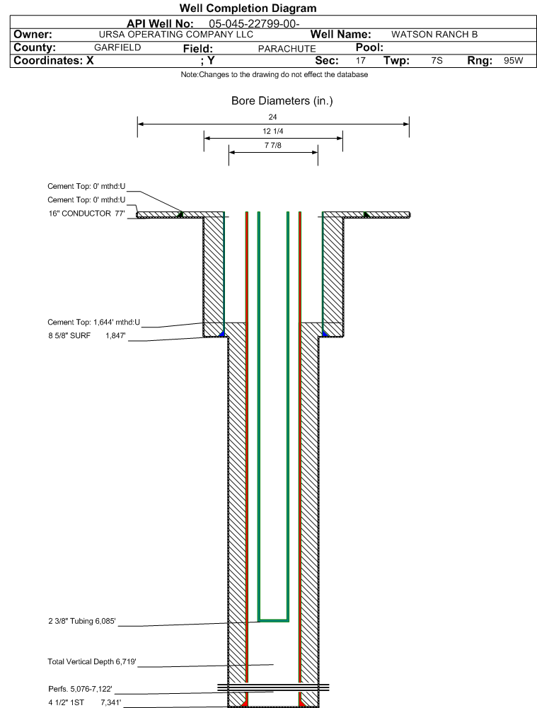 | Wellbore Completed | | Completion Date: | 4/17/2015 | | Spud Date: | 3/14/2015 | Spud Date Is: | ACTUAL | | Measured TD: | 7356 ft. | Measured PB depth: | 7294 ft. | | True Vertical TD: | 6719 ft. | True Vertical PB depth: | 6657 ft. | | Top PZ Location: | Sec:17 Twp: 7S 95W | Footage: 2211 FNL 1996 FEL | | Bottom Hole Location: | Sec:17 Twp: 7S 95W | Footage: 2211 FNL 1996 FEL | | Log Types: | CBL, MUD, PULSED NEUTRON. NO OPEN HOLE LOGS WERE RUN ON THIS WELL. IN ACCORDANCE WITH RULE 317.p., OPEN HOLE LOGS WERE RUN ON THE WATSON RANCH B 24AWI (API # 05-045-22801). | | Casing: | String Type: CONDUCTOR, Hole Size: 24 in., Size: 16 in., Top: 0 ft., Depth: 77 ft., Weight: 75 , Citings Type: ACTUAL | | Cement: | Sacks: 70, Top: 0 ft., Bottom: 77 ft., Determination Method: VISU | | Casing: | String Type: SURF, Hole Size: 12.25 in., Size: 8.625 in., Top: 0 ft., Depth: 1847 ft., Weight: 32 , Citings Type: ACTUAL | | Cement: | Sacks: 410, Top: 0 ft., Bottom: 1847 ft., Determination Method: VISU | | Casing: | String Type: 1ST, Hole Size: 7.875 in., Size: 4.5 in., Top: 0 ft., Depth: 7341 ft., Weight: 11.6 , Citings Type: ACTUAL | | Cement: | Sacks: 891, Top: 1644 ft., Bottom: 7341 ft., Determination Method: CBL | | Formation | Interval Top | Log Bottom | Cored | DSTs | | WILLIAMS FORK | 4053 ft. | | N | N | | CAMEO | 6650 ft. | | N | N | | ROLLINS | 7161 ft. | | N | N |