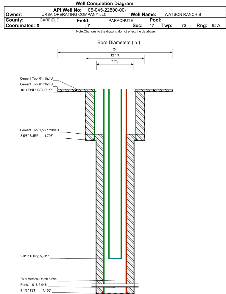 | Wellbore Completed | | Completion Date: | 4/24/2015 | | Spud Date: | 3/9/2015 | Spud Date Is: | ACTUAL | | Measured TD: | 7180 ft. | Measured PB depth: | 7112 ft. | | True Vertical TD: | 6694 ft. | True Vertical PB depth: | 6626 ft. | | Top PZ Location: | Sec:17 Twp: 7S 95W | Footage: 2398 FSL 1970 FEL | | Bottom Hole Location: | Sec:17 Twp: 7S 95W | Footage: 2398 FSL 1970 FEL | | Log Types: | CBL, MUD, PULSED NEUTRON. NO OPEN HOLE LOGS WERE RUN ON THIS WELL. IN ACCORDANCE WITH RULE 317.p., OPEN HOLE LOGS WERE RUN ON THE WATSON RANCH B 24AWI (API # 05-045-22801). | | Casing: | String Type: CONDUCTOR, Hole Size: 24 in., Size: 16 in., Top: 0 ft., Depth: 77 ft., Weight: 75 , Citings Type: ACTUAL | | Cement: | Sacks: 70, Top: 0 ft., Bottom: 77 ft., Determination Method: VISU | | Casing: | String Type: SURF, Hole Size: 12.25 in., Size: 8.625 in., Top: 0 ft., Depth: 1795 ft., Weight: 32 , Citings Type: ACTUAL | | Cement: | Sacks: 410, Top: 0 ft., Bottom: 1795 ft., Determination Method: VISU | | Casing: | String Type: 1ST, Hole Size: 7.875 in., Size: 4.5 in., Top: 0 ft., Depth: 7158 ft., Weight: 11.6 , Citings Type: ACTUAL | | Cement: | Sacks: 880, Top: 1580 ft., Bottom: 7158 ft., Determination Method: CBL | | Formation | Interval Top | Log Bottom | Cored | DSTs | | WILLIAMS FORK | 4004 ft. | | N | N | | CAMEO | 6468 ft. | | N | N | | ROLLINS | 6997 ft. | | N | N |