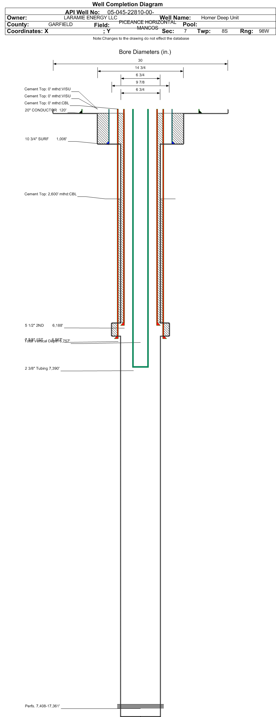 | Wellbore Completed | | Completion Date: | 8/29/2015 | | Spud Date: | 4/1/2015 | Spud Date Is: | ACTUAL | | Measured TD: | 17600 ft. | Measured PB depth: | 17584 ft. | | True Vertical TD: | 6757 ft. | True Vertical PB depth: | 6757 ft. | | Top PZ Location: | Sec:7 Twp: 8S 98W | Footage: 522 FSL 2118 FWL | | Bottom Hole Location: | Sec:20 Twp: 8S 98W | Footage: 2539 FNL 1851 FWL | | Log Types: | CBL; Open-hole logs run on Homer Deep Unit 7-23CH (045-22811) | | Log Types: | CBL, MWD | | Casing: | String Type: CONDUCTOR, Hole Size: 30 in., Size: 20 in., Top: 0 ft., Depth: 120 ft., Weight: Line , Citings Type: ACTUAL | | Cement: | Sacks: 320, Top: 0 ft., Bottom: 120 ft., Determination Method: VISU | | Casing: | String Type: SURF, Hole Size: 14.75 in., Size: 10.75 in., Top: 0 ft., Depth: 1006 ft., Weight: 40.5 , Citings Type: ACTUAL | | Cement: | Sacks: 400, Top: 0 ft., Bottom: 1006 ft., Determination Method: VISU | | Casing: | String Type: 1ST, Hole Size: 9.875 in., Size: 7.625 in., Top: 0 ft., Depth: 6567 ft., Weight: 29.7 , Citings Type: ACTUAL | | Cement: | Sacks: 685, Top: 2600 ft., Bottom: 6567 ft., Determination Method: CBL | | Casing: | String Type: 2ND, Hole Size: 6.75 in., Size: 5.5 in., Top: 0 ft., Depth: 6188 ft., Weight: 20 , Citings Type: ACTUAL | | Cement: | Sacks: , Top: , Bottom: , Determination Method: CBL | | Casing: | String Type: TAPER, Hole Size: 6.75 in., Size: 4.5 in., Top: 6188 ft., Depth: 17584 ft., Weight: 13.5 , Citings Type: ACTUAL | | Cement: | Sacks: 1420, Top: 6580 ft., Bottom: 17588 ft., Determination Method: CBL | | Additional Cement: | String Type: 1ST , Top: 2598 ft., Depth: 3608 ft., Bottom: 3608 ft., Sacks: 545, Method: STAGE TOOL | | Additional Cement: | String Type: S.C. 1.1 , Top: 2600 ft., Depth: 3608 ft., Bottom: 3608 ft., Sacks: 545, Method: DV TOOL | | Formation | Interval Top | Log Bottom | Cored | DSTs | | MESAVERDE | 890 ft. | 3866 ft. | N | N | | CAMEO COALS-MESAVERDE | 3023 ft. | | | | | ROLLINS | 3236 ft. | | | | | COZZETTE | 3415 ft. | | | | | CORCORAN | 3657 ft. | | | | | MANCOS | 3866 ft. | | | | | MANCOS A | 4413 ft. | | | | | MANCOS B | 5517 ft. | | | | | NIOBRARA | 6495 ft. | | | |