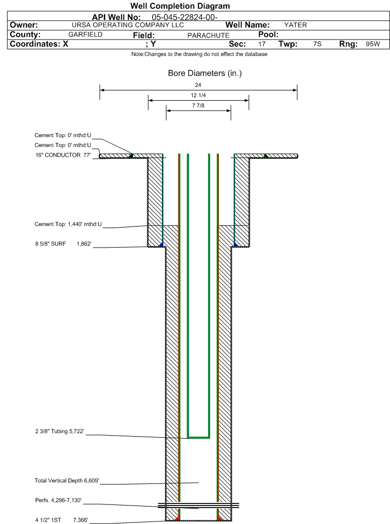 | Wellbore Completed | | Completion Date: | 8/9/2015 | | Spud Date: | 7/30/2015 | Spud Date Is: | ACTUAL | | Measured TD: | 7381 ft. | Measured PB depth: | 7320 ft. | | True Vertical TD: | 6609 ft. | True Vertical PB depth: | 6548 ft. | | Top PZ Location: | Sec:18 Twp: 7S 95W | Footage: 1514 FNL 699 FEL | | Bottom Hole Location: | Sec:18 Twp: 7S 95W | Footage: 1514 FNL 699 FEL | | Log Types: | CBL, MUD, PULSED NEUTRON. NO OPEN HOLE LOGS WERE RUN ON THIS WELL. IN ACCORDANCE WITH RULE 317.p.,OPEN HOLE LOGS WERE RUN ON THE YATER 12D-17-07-95 (API # 05-045-22761). | | Casing: | String Type: CONDUCTOR, Hole Size: 24 in., Size: 16 in., Top: 0 ft., Depth: 77 ft., Weight: 75 , Citings Type: ACTUAL | | Cement: | Sacks: 70, Top: 0 ft., Bottom: 77 ft., Determination Method: VISU | | Casing: | String Type: SURF, Hole Size: 12.25 in., Size: 8.625 in., Top: 0 ft., Depth: 1862 ft., Weight: 32 , Citings Type: ACTUAL | | Cement: | Sacks: 392, Top: 0 ft., Bottom: 1862 ft., Determination Method: VISU | | Casing: | String Type: 1ST, Hole Size: 7.875 in., Size: 4.5 in., Top: 0 ft., Depth: 7366 ft., Weight: 11.6 , Citings Type: ACTUAL | | Cement: | Sacks: 965, Top: 1440 ft., Bottom: 7366 ft., Determination Method: CBL | | Formation | Interval Top | Log Bottom | Cored | DSTs | | WILLIAMS FORK | 4046 ft. | | N | N | | CAMEO | 6682 ft. | | N | N | | ROLLINS | 7180 ft. | | N | N |