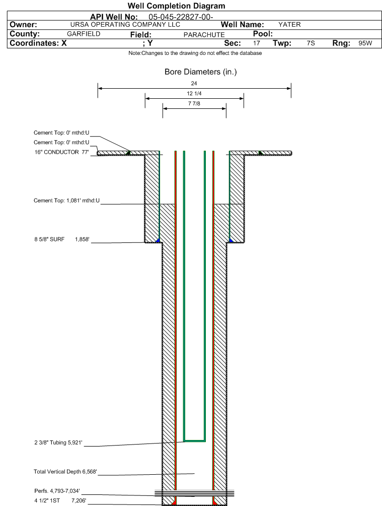 | Wellbore Completed | | Completion Date: | 8/12/2015 | | Spud Date: | 7/29/2015 | Spud Date Is: | ACTUAL | | Measured TD: | 7220 ft. | Measured PB depth: | 7160 ft. | | True Vertical TD: | 6568 ft. | True Vertical PB depth: | 6508 ft. | | Top PZ Location: | Sec:18 Twp: 7S 95W | Footage: 1852 FNL 687 FEL | | Bottom Hole Location: | Sec:18 Twp: 7S 95W | Footage: 1852 FNL 687 FEL | | Log Types: | CBL, MUD, PULSED NEUTRON. NO OPEN HOLE LOGS WERE RUN ON THIS WELL. IN ACCORDANCE WITH RULE 317.p.,OPEN HOLE LOGS WERE RUN ON THE YATER 12D-17-07-95 (API # 05-045-22761). | | Casing: | String Type: CONDUCTOR, Hole Size: 24 in., Size: 16 in., Top: 0 ft., Depth: 77 ft., Weight: 75 , Citings Type: ACTUAL | | Cement: | Sacks: 70, Top: 0 ft., Bottom: 77 ft., Determination Method: VISU | | Casing: | String Type: SURF, Hole Size: 12.25 in., Size: 8.625 in., Top: 0 ft., Depth: 1858 ft., Weight: 32 , Citings Type: ACTUAL | | Cement: | Sacks: 387, Top: 0 ft., Bottom: 1858 ft., Determination Method: VISU | | Casing: | String Type: 1ST, Hole Size: 7.875 in., Size: 4.5 in., Top: 0 ft., Depth: 7206 ft., Weight: 11.6 , Citings Type: ACTUAL | | Cement: | Sacks: 948, Top: 1081 ft., Bottom: 7206 ft., Determination Method: CBL | | Formation | Interval Top | Log Bottom | Cored | DSTs | | WILLIAMS FORK | 3928 ft. | | N | N | | CAMEO | 6538 ft. | | N | N | | ROLLINS | 7042 ft. | | N | N |