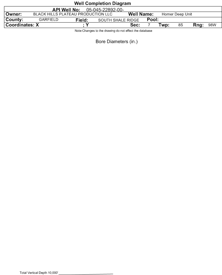 Wellbore #00 Wellbore Classification: Status: AL - 5/9/2018 Measured TD: | Wellbore Data for Original Wellbore | Wellbore Classification: AL - 5/9/2018 | | Wellbore Permit | HORIZONTAL | | Permit #: | | Expiration Date: | 7/30/2017 | | Proposed Top PZ Location: | Sec:7 Twp: 8S 98W | Footage: 1123 FSL 2363 FWL | | Bottom Hole Location: | Sec:20 Twp: 8S 98W | Footage: 1535 FNL 2382 FWL | | Proposed Depth/Form: | 17526 ft. | | Surface Mineral Owner Same: | No | | Mineral Owner: | FEDERAL | Surface Owner: | FEDERAL | | Unit: | Homer Deep Unit | Unit Number: | COC72921X | | Formation And Spacing: | Code: MNCS , Formation: MANCOS , Order: , Unit Acreage: , Drill Unit: | | Casing: | String Type: CONDUCTOR, Hole Size: 30 in., Size: 20 in., Top: 0 ft., Depth: 120 ft., Weight: Line , Citings Type: PLANNED | | Cement: | Sacks: 320, Top: 0 ft., Bottom: 120 ft. | | Casing: | String Type: SURF, Hole Size: 14.75 in., Size: 10.75 in., Top: 0 ft., Depth: 1000 ft., Weight: 40.5 , Citings Type: PLANNED | | Cement: | Sacks: 420, Top: 0 ft., Bottom: 1000 ft. | | Casing: | String Type: 1ST, Hole Size: 9.875 in., Size: 7.625 in., Top: 0 ft., Depth: 6575 ft., Weight: 29.7 , Citings Type: PLANNED | | Cement: | Sacks: 950, Top: 800 ft., Bottom: 6575 ft. | | Casing: | String Type: 2ND, Hole Size: 6.75 in., Size: 5.5 in., Top: 0 ft., Depth: 6000 ft., Weight: 17 , Citings Type: PLANNED | | Cement: | Sacks: , Top: , Bottom: | | Casing: | String Type: TAPER, Hole Size: 6.75 in., Size: 4.5 in., Top: 6000 ft., Depth: 17526 ft., Weight: 11.6 , Citings Type: PLANNED | | Cement: | Sacks: 1525, Top: 6375 ft., Bottom: 17526 ft. |