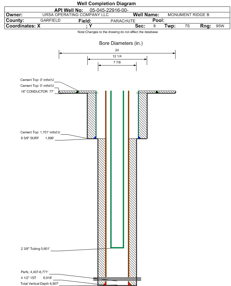 | Wellbore Completed | | Completion Date: | 1/29/2016 | | Spud Date: | 1/18/2016 | Spud Date Is: | ACTUAL | | Measured TD: | 6935 ft. | Measured PB depth: | 6873 ft. | | True Vertical TD: | 6907 ft. | True Vertical PB depth: | 6845 ft. | | Top PZ Location: | Sec:8 Twp: 7S 95W | Footage: 911 FSL 634 FEL | | Bottom Hole Location: | Sec:8 Twp: 7S 95W | Footage: 908 FSL 658 FEL | | Log Types: | CBL/MUD/PULSED NEUTRON/TRIPLE COMBO RUN ON 045-22915 | | Casing: | String Type: CONDUCTOR, Hole Size: 24 in., Size: 16 in., Top: 0 ft., Depth: 77 ft., Weight: 75 , Citings Type: ACTUAL | | Cement: | Sacks: 70, Top: 0 ft., Bottom: 77 ft., Determination Method: VISU | | Casing: | String Type: SURF, Hole Size: 12.25 in., Size: 8.625 in., Top: 0 ft., Depth: 1696 ft., Weight: 32 , Citings Type: ACTUAL | | Cement: | Sacks: 381, Top: 0 ft., Bottom: 1696 ft., Determination Method: VISU | | Casing: | String Type: 1ST, Hole Size: 7.875 in., Size: 4.5 in., Top: 0 ft., Depth: 6918 ft., Weight: 11.6 , Citings Type: ACTUAL | | Cement: | Sacks: 867, Top: 1701 ft., Bottom: 6918 ft., Determination Method: CBL | | Formation | Interval Top | Log Bottom | Cored | DSTs | | WASATCH | 0 ft. | | N | N | | WILLIAMS FORK | 3752 ft. | | N | N | | CAMEO | 6074 ft. | | N | N | | ROLLINS | 6785 ft. | | N | N |