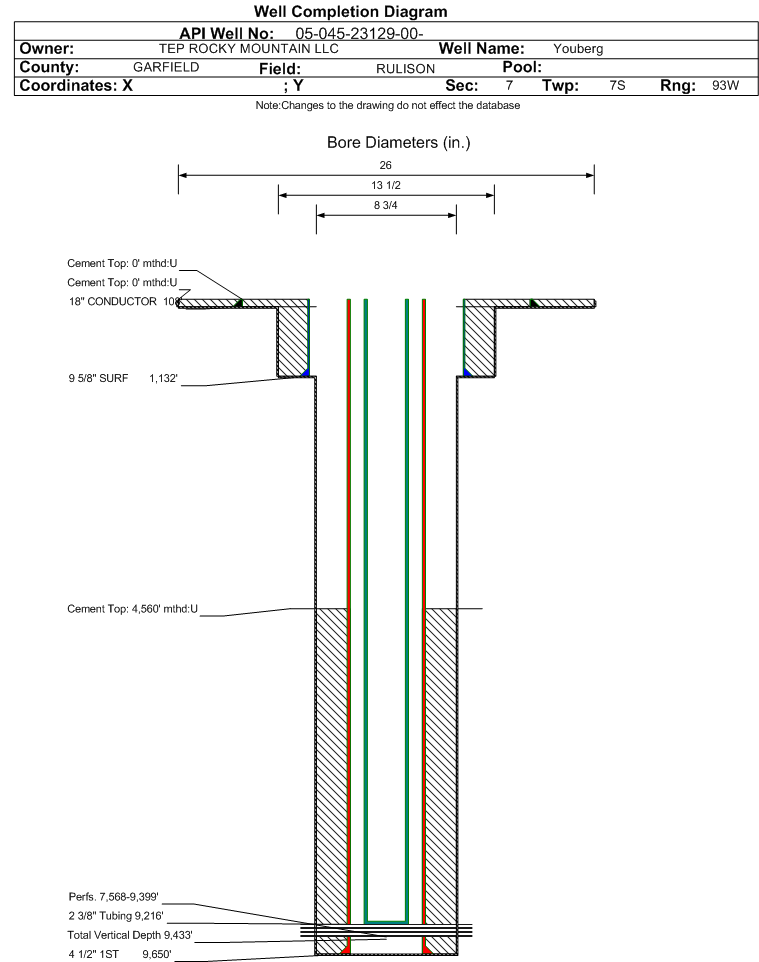 Wellbore #00 Wellbore Classification: GW Status: PR - 11/28/2016 Measured TD: 9660 ft. Vertical TD: 9433 ft.| Wellbore Data for Original Wellbore | Wellbore Classification: GW PR - 11/28/2016 | | Wellbore Permit | DIRECTIONAL | | Permit #: | | Expiration Date: | 4/28/2018 | | Proposed Top PZ Location: | Sec:7 Twp: 7S 93W | Footage: 1762 FSL 1345 FWL | | Bottom Hole Location: | Sec:7 Twp: 7S 93W | Footage: 1762 FSL 1345 FWL | | Proposed Depth/Form: | 9601 ft. | | Surface Mineral Owner Same: | No | | Mineral Owner: | FEE | Surface Owner: | FEE | | Unit: | | Unit Number: | | | Formation And Spacing: | Code: WMFK , Formation: WILLIAMS FORK , Order: 139-76 , Unit Acreage: , Drill Unit: | | Casing: | String Type: CONDUCTOR, Hole Size: 26 in., Size: 18 in., Top: 0 ft., Depth: 80 ft., Weight: 48 , Citings Type: PLANNED | | Cement: | Sacks: 30, Top: 0 ft., Bottom: 80 ft. | | Casing: | String Type: SURF, Hole Size: 13.5 in., Size: 9.625 in., Top: 0 ft., Depth: 1124 ft., Weight: 32.3 , Citings Type: PLANNED | | Cement: | Sacks: 296, Top: 0 ft., Bottom: 1124 ft. | | Casing: | String Type: 1ST, Hole Size: 8.75 in., Size: 4.5 in., Top: 0 ft., Depth: 9601 ft., Weight: 11.6 , Citings Type: PLANNED | | Cement: | Sacks: 781, Top: 5703 ft., Bottom: 9601 ft. |