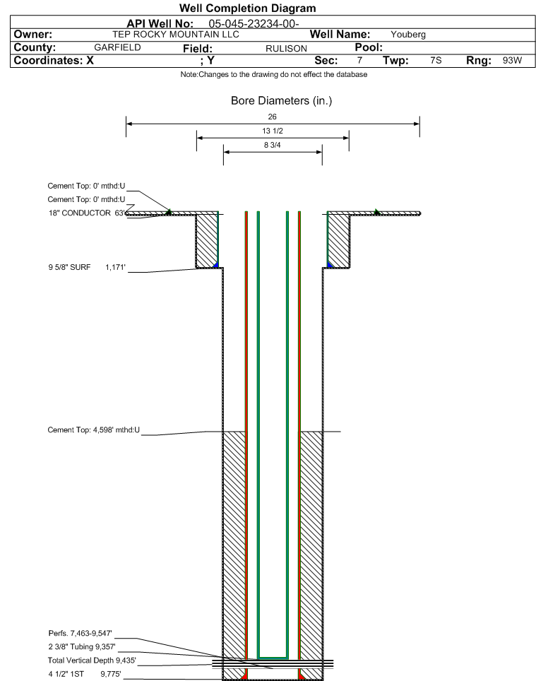 Wellbore #00 Wellbore Classification: GW Status: PR - 11/21/2016 Measured TD: 9782 ft. Vertical TD: 9435 ft.| Wellbore Data for Original Wellbore | Wellbore Classification: GW PR - 11/21/2016 | | Wellbore Permit | DIRECTIONAL | | Permit #: | | Expiration Date: | 6/9/2018 | | Proposed Top PZ Location: | Sec:7 Twp: 7S 93W | Footage: 739 FNL 191 FWL | | Bottom Hole Location: | Sec:7 Twp: 7S 93W | Footage: 739 FNL 191 FWL | | Proposed Depth/Form: | 9764 ft. | | Surface Mineral Owner Same: | No | | Mineral Owner: | FEE | Surface Owner: | FEE | | Unit: | | Unit Number: | | | Formation And Spacing: | Code: WMFK , Formation: WILLIAMS FORK , Order: 139-76 , Unit Acreage: , Drill Unit: | | Casing: | String Type: CONDUCTOR, Hole Size: 26 in., Size: 18 in., Top: 0 ft., Depth: 60 ft., Weight: 48 , Citings Type: PLANNED | | Cement: | Sacks: 23, Top: 0 ft., Bottom: 60 ft. | | Casing: | String Type: SURF, Hole Size: 13.5 in., Size: 9.625 in., Top: 0 ft., Depth: 1124 ft., Weight: 32.3 , Citings Type: PLANNED | | Cement: | Sacks: 296, Top: 0 ft., Bottom: 1124 ft. | | Casing: | String Type: 1ST, Hole Size: 8.75 in., Size: 4.5 in., Top: 0 ft., Depth: 9764 ft., Weight: 11.6 , Citings Type: PLANNED | | Cement: | Sacks: 792, Top: , Bottom: 9764 ft. |