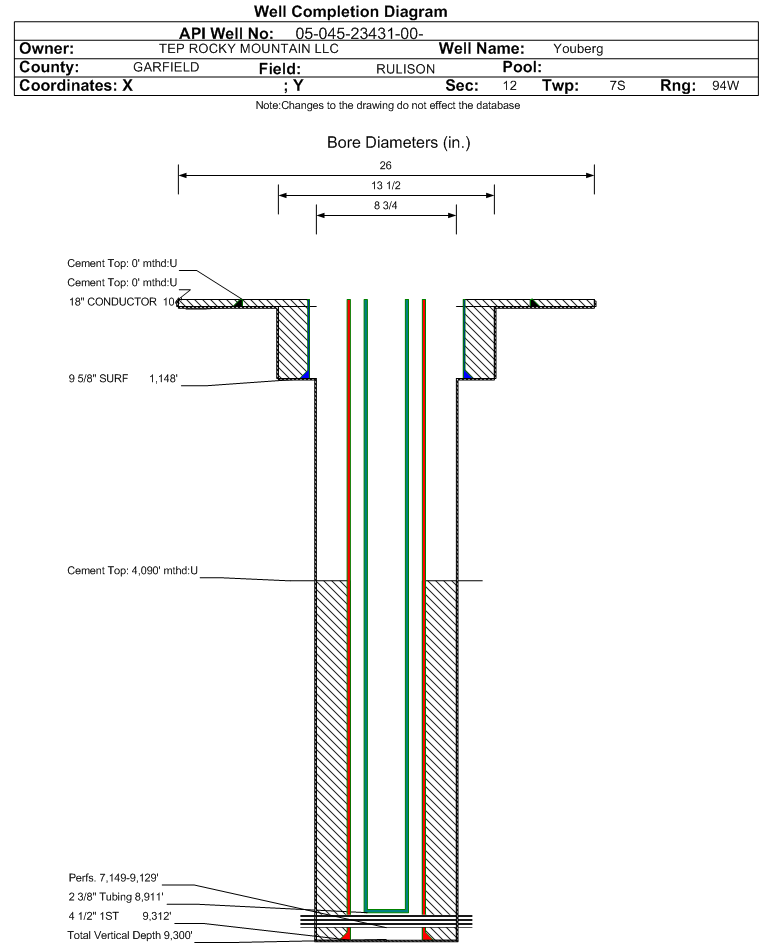 Wellbore #00 Wellbore Classification: GW Status: PR - 3/1/2023 Measured TD: 9312 ft. Vertical TD: 9300 ft.| Wellbore Data for Original Wellbore | Wellbore Classification: GW PR - 3/1/2023 | | Wellbore Permit | DIRECTIONAL | | Permit #: | | Expiration Date: | 11/28/2018 | | Proposed Top PZ Location: | Sec:12 Twp: 7S 94W | Footage: 1602 FNL 2050 FEL | | Bottom Hole Location: | Sec:12 Twp: 7S 94W | Footage: 1602 FNL 2050 FEL | | Proposed Depth/Form: | 9324 ft. | | Surface Mineral Owner Same: | No | | Mineral Owner: | FEE | Surface Owner: | FEE | | Unit: | | Unit Number: | | | Formation And Spacing: | Code: WMFK , Formation: WILLIAMS FORK , Order: 139-76 , Unit Acreage: 640, Drill Unit: All of Sec. 12 | | Casing: | String Type: CONDUCTOR, Hole Size: 26 in., Size: 18 in., Top: 0 ft., Depth: 80 ft., Weight: 48 , Citings Type: PLANNED | | Cement: | Sacks: 35, Top: 0 ft., Bottom: 80 ft. | | Casing: | String Type: SURF, Hole Size: 13.5 in., Size: 9.625 in., Top: 0 ft., Depth: 1100 ft., Weight: 32.3 , Citings Type: PLANNED | | Cement: | Sacks: 266, Top: 0 ft., Bottom: 1100 ft. | | Casing: | String Type: 1ST, Hole Size: 8.75 in., Size: 4.5 in., Top: 0 ft., Depth: 9324 ft., Weight: 11.6 , Citings Type: PLANNED | | Cement: | Sacks: 865, Top: 4642 ft., Bottom: 9324 ft. |
