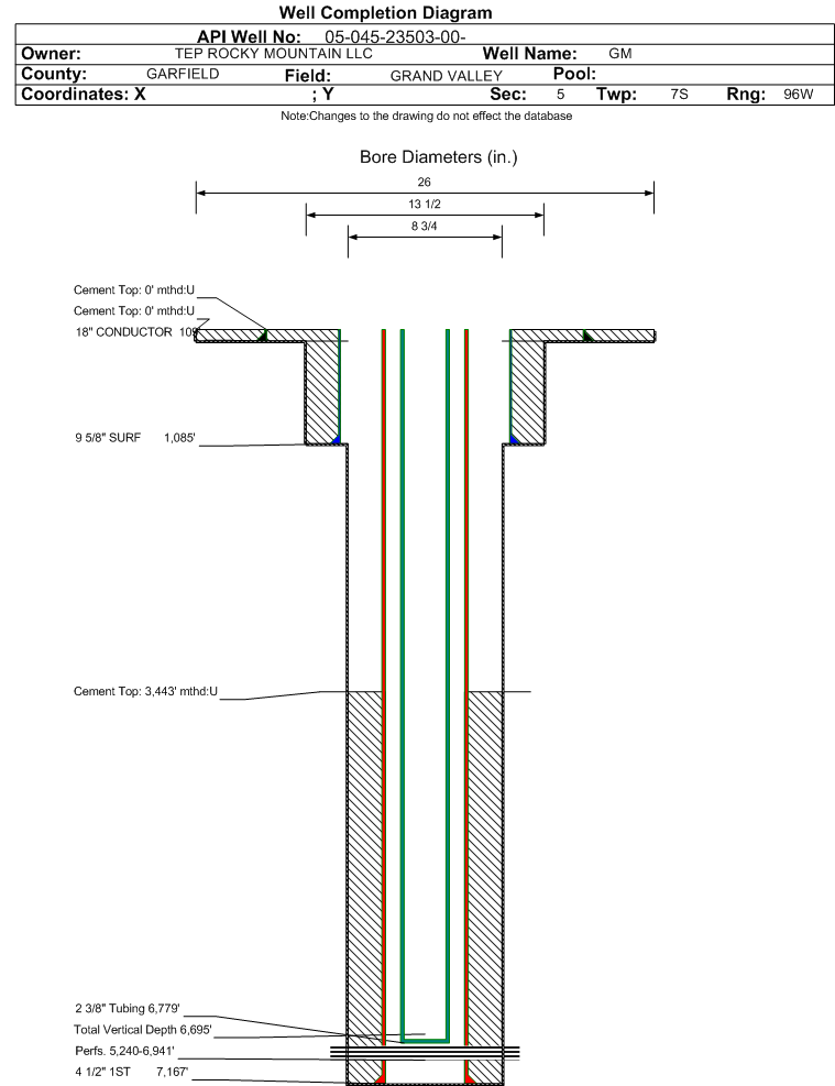 | Wellbore Completed | | Completion Date: | 9/30/2017 | | Spud Date: | 9/26/2017 | Spud Date Is: | ACTUAL | | Measured TD: | 7167 ft. | Measured PB depth: | 7120 ft. | | True Vertical TD: | 6695 ft. | True Vertical PB depth: | 6648 ft. | | Top PZ Location: | Sec:5 Twp: 7S 96W | Footage: 2019 FSL 664 FWL | | Bottom Hole Location: | Sec:5 Twp: 7S 96W | Footage: 2041 FSL 644 FWL | | Log Types: | CBL/PULSED NEUTRON LOG/TRIPLE COMBO IN 045-22668 | | Casing: | String Type: CONDUCTOR, Hole Size: 26 in., Size: 18 in., Top: 0 ft., Depth: 109 ft., Weight: 47.44 , Citings Type: ACTUAL | | Cement: | Sacks: 182, Top: 0 ft., Bottom: 109 ft., Determination Method: VISU | | Casing: | String Type: SURF, Hole Size: 13.5 in., Size: 9.625 in., Top: 0 ft., Depth: 1085 ft., Weight: 32.3 , Citings Type: ACTUAL | | Cement: | Sacks: 280, Top: 0 ft., Bottom: 1085 ft., Determination Method: VISU | | Casing: | String Type: 1ST, Hole Size: 8.75 in., Size: 4.5 in., Top: 0 ft., Depth: 7167 ft., Weight: 11.6 , Citings Type: ACTUAL | | Cement: | Sacks: 870, Top: 3443 ft., Bottom: 7167 ft., Determination Method: CBL | | Formation | Interval Top | Log Bottom | Cored | DSTs | | WASATCH G | 2247 ft. | | | | | MESAVERDE | 4037 ft. | | | | | OHIO CREEK | 4037 ft. | | | | | WILLIAMS FORK | 4219 ft. | | | | | CAMEO | 6668 ft. | | | | | ROLLINS | 7016 ft. | | | |