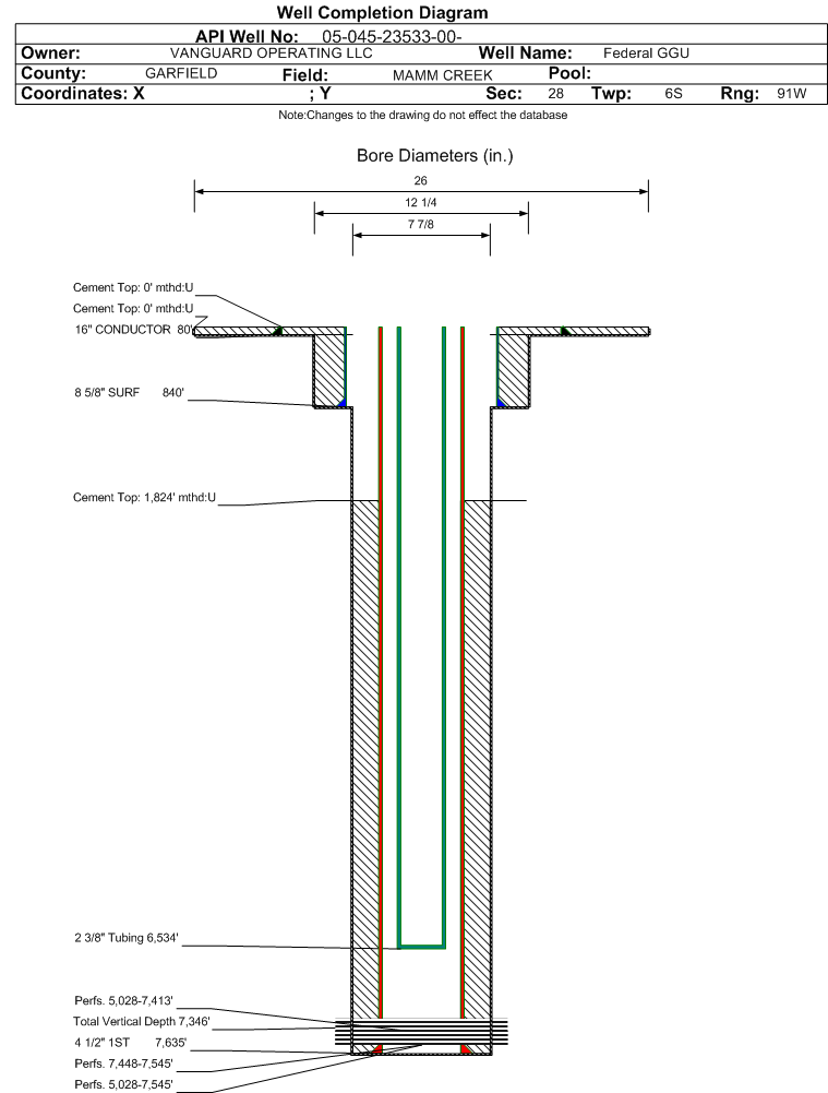 | | Perforation Data: | | Interval Top: | 5028 ft. | # Of Holes: | 333 | | Interval Bottom: | 7413 ft. | Hole Size: | 0.37 in. |