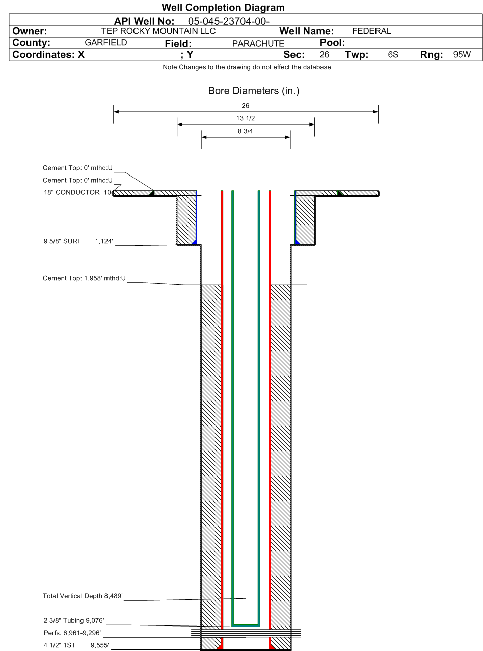 | Wellbore Completed | | Completion Date: | 5/31/2018 | | Spud Date: | 5/26/2018 | Spud Date Is: | ACTUAL | | Measured TD: | 9565 ft. | Measured PB depth: | 9522 ft. | | True Vertical TD: | 8489 ft. | True Vertical PB depth: | 8446 ft. | | Top PZ Location: | Sec:26 Twp: 6S 95W | Footage: 264 FNL 803 FWL | | Bottom Hole Location: | Sec:26 Twp: 6S 95W | Footage: 146 FNL 730 FWL | | Log Types: | CBL, PULSED NEUTRON (TRIPLE COMBO IN API 045-23709) | | Casing: | String Type: CONDUCTOR, Hole Size: 26 in., Size: 18 in., Top: 0 ft., Depth: 104 ft., Weight: 47.44 , Citings Type: ACTUAL | | Cement: | Sacks: 174, Top: 0 ft., Bottom: 104 ft., Determination Method: VISU | | Casing: | String Type: SURF, Hole Size: 13.5 in., Size: 9.625 in., Top: 0 ft., Depth: 1124 ft., Weight: 36 , Citings Type: ACTUAL | | Cement: | Sacks: 300, Top: 0 ft., Bottom: 1124 ft., Determination Method: VISU | | Casing: | String Type: 1ST, Hole Size: 8.75 in., Size: 4.5 in., Top: 0 ft., Depth: 9555 ft., Weight: 11.6 , Citings Type: ACTUAL | | Cement: | Sacks: 1940, Top: 1958 ft., Bottom: 9565 ft., Determination Method: CBL | | Formation | Interval Top | Log Bottom | Cored | DSTs | | WASATCH G | 5203 ft. | | | | | WILLIAMS FORK | 5743 ft. | | | | | MESAVERDE | 5800 ft. | | | | | OHIO CREEK | 5800 ft. | | | | | CAMEO | 9027 ft. | | | | | ROLLINS | 9356 ft. | | | |