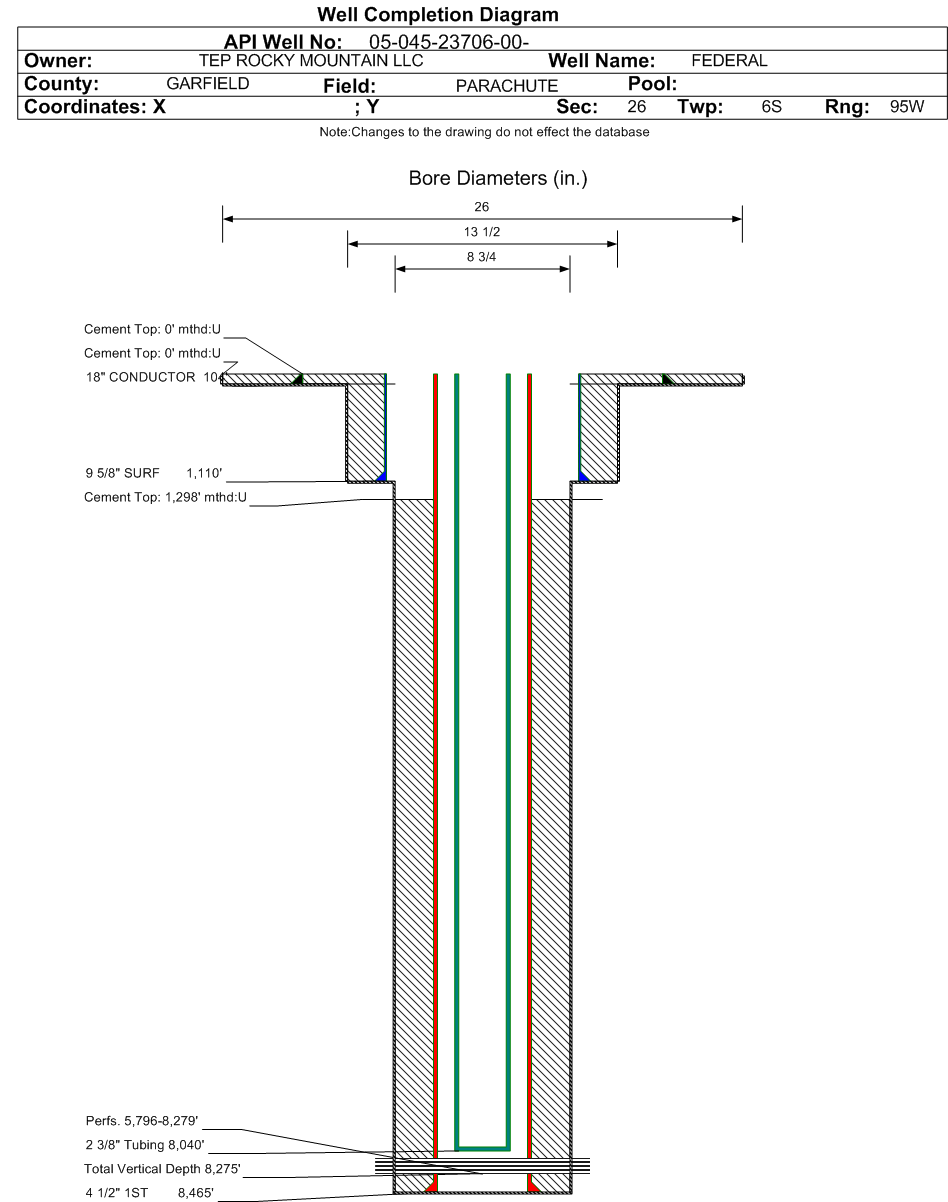 | Wellbore Completed | | Completion Date: | 6/18/2018 | | Spud Date: | 6/12/2018 | Spud Date Is: | ACTUAL | | Measured TD: | 8475 ft. | Measured PB depth: | 8434 ft. | | True Vertical TD: | 8275 ft. | True Vertical PB depth: | 8234 ft. | | Top PZ Location: | Sec:26 Twp: 6S 95W | Footage: 1620 FSL 1647 FEL | | Bottom Hole Location: | Sec:26 Twp: 6S 95W | Footage: 1581 FSL 1574 FEL | | Log Types: | CBL, PULSED NEUTRON (TRIPLE COMBO IN API 045-23709) | | Casing: | String Type: CONDUCTOR, Hole Size: 26 in., Size: 18 in., Top: 0 ft., Depth: 104 ft., Weight: 47.44 , Citings Type: ACTUAL | | Cement: | Sacks: 174, Top: 0 ft., Bottom: 104 ft., Determination Method: VISU | | Casing: | String Type: SURF, Hole Size: 13.5 in., Size: 9.625 in., Top: 0 ft., Depth: 1110 ft., Weight: 36 , Citings Type: ACTUAL | | Cement: | Sacks: 300, Top: 0 ft., Bottom: 1110 ft., Determination Method: VISU | | Casing: | String Type: 1ST, Hole Size: 8.75 in., Size: 4.5 in., Top: 0 ft., Depth: 8465 ft., Weight: 11.6 , Citings Type: ACTUAL | | Cement: | Sacks: 2002, Top: 1298 ft., Bottom: 8475 ft., Determination Method: CBL | | Formation | Interval Top | Log Bottom | Cored | DSTs | | WASATCH G | 2474 ft. | | | | | WILLIAMS FORK | 4753 ft. | | | | | MESAVERDE | 4864 ft. | | | | | OHIO CREEK | 4864 ft. | | | | | CAMEO | 7932 ft. | | | | | ROLLINS | 8342 ft. | | | |