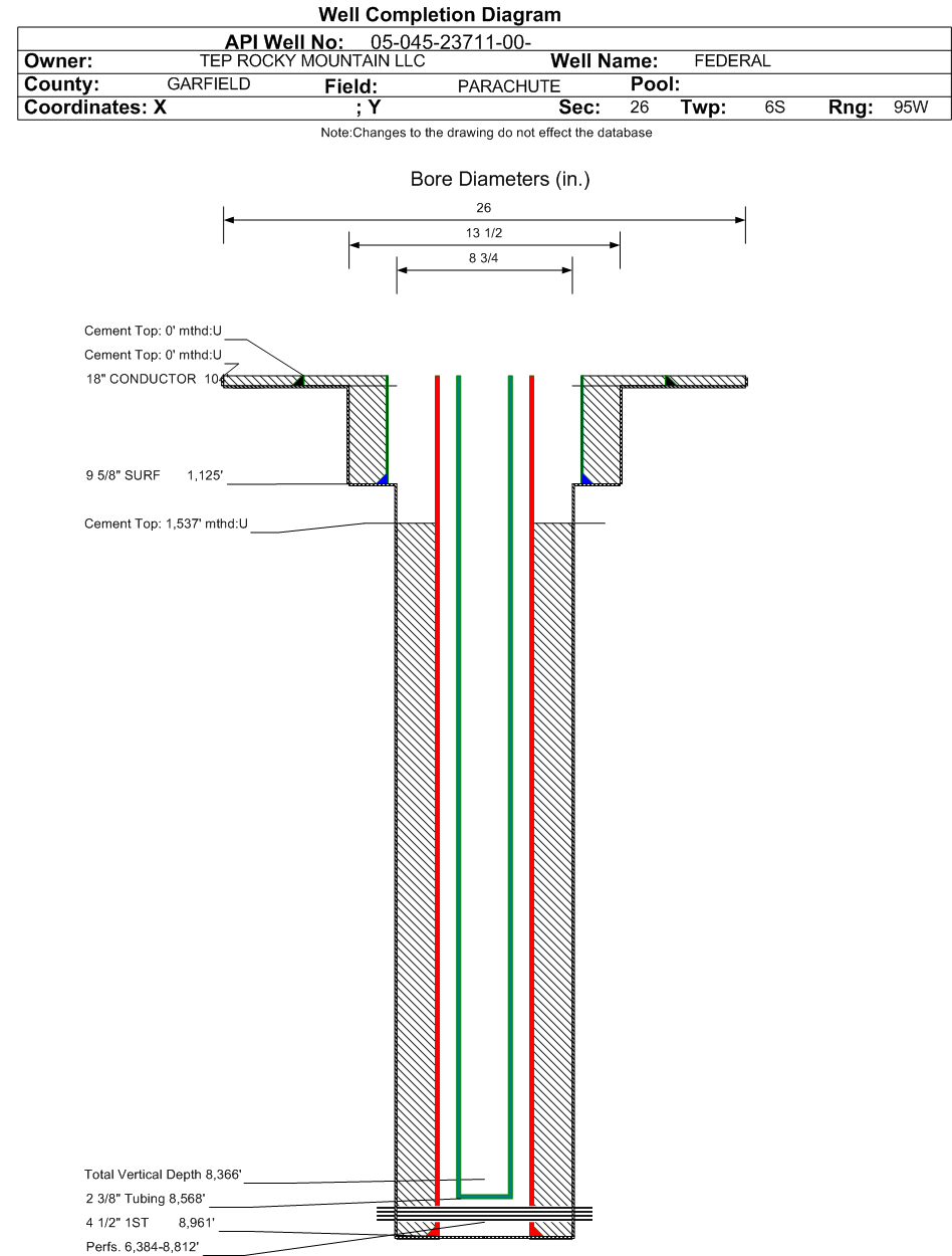 | Wellbore Completed | | Completion Date: | 7/20/2018 | | Spud Date: | 7/16/2018 | Spud Date Is: | ACTUAL | | Measured TD: | 8990 ft. | Measured PB depth: | 8930 ft. | | True Vertical TD: | 8366 ft. | True Vertical PB depth: | 8306 ft. | | Top PZ Location: | Sec:26 Twp: 6S 95W | Footage: 676 FNL 2262 FWL | | Bottom Hole Location: | Sec:26 Twp: 6S 95W | Footage: 590 FNL 2262 FWL | | Log Types: | CBL, PULSED NEUTRON (TRIPLE COMBO IN 045-23709) | | Casing: | String Type: CONDUCTOR, Hole Size: 26 in., Size: 18 in., Top: 0 ft., Depth: 104 ft., Weight: 47.44 , Citings Type: ACTUAL | | Cement: | Sacks: 174, Top: 0 ft., Bottom: 104 ft., Determination Method: VISU | | Casing: | String Type: SURF, Hole Size: 13.5 in., Size: 9.625 in., Top: 0 ft., Depth: 1125 ft., Weight: 36 , Citings Type: ACTUAL | | Cement: | Sacks: 300, Top: 0 ft., Bottom: 1125 ft., Determination Method: VISU | | Casing: | String Type: 1ST, Hole Size: 8.75 in., Size: 4.5 in., Top: 0 ft., Depth: 8961 ft., Weight: 11.6 , Citings Type: ACTUAL | | Cement: | Sacks: 1830, Top: 1537 ft., Bottom: 8990 ft., Determination Method: CBL | | Formation | Interval Top | Log Bottom | Cored | DSTs | | WASATCH G | 2626 ft. | | | | | WILLIAMS FORK | 5258 ft. | | | | | MESAVERDE | 5320 ft. | | | | | OHIO CREEK | 5320 ft. | | | | | CAMEO | 8591 ft. | | | | | ROLLINS | 8896 ft. | | | |
