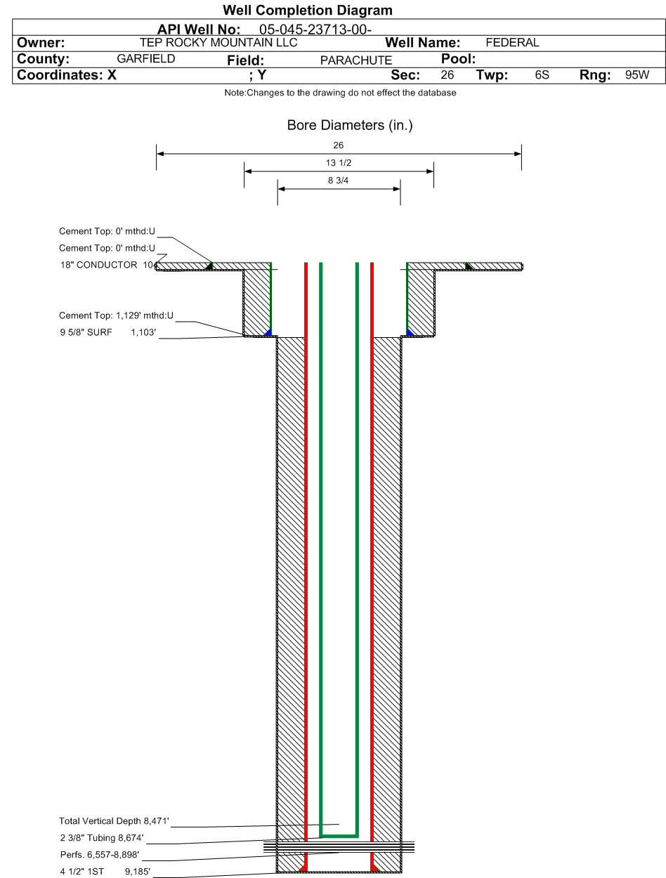 | Wellbore Completed | | Completion Date: | 6/23/2018 | | Spud Date: | 6/19/2018 | Spud Date Is: | ACTUAL | | Measured TD: | 9195 ft. | Measured PB depth: | 9154 ft. | | True Vertical TD: | 8471 ft. | True Vertical PB depth: | 8430 ft. | | Top PZ Location: | Sec:26 Twp: 6S 95W | Footage: 944 FNL 913 FWL | | Bottom Hole Location: | Sec:26 Twp: 6S 95W | Footage: 918 FNL 812 FWL | | Log Types: | CBL, PULSED NEUTRON (TRIPLE COMBO IN API 045-23709) | | Casing: | String Type: CONDUCTOR, Hole Size: 26 in., Size: 18 in., Top: 0 ft., Depth: 104 ft., Weight: 47.44 , Citings Type: ACTUAL | | Cement: | Sacks: 174, Top: 0 ft., Bottom: 104 ft., Determination Method: VISU | | Casing: | String Type: SURF, Hole Size: 13.5 in., Size: 9.625 in., Top: 0 ft., Depth: 1103 ft., Weight: 36 , Citings Type: ACTUAL | | Cement: | Sacks: 300, Top: 0 ft., Bottom: 1103 ft., Determination Method: VISU | | Casing: | String Type: 1ST, Hole Size: 8.75 in., Size: 4.5 in., Top: 0 ft., Depth: 9185 ft., Weight: 11.6 , Citings Type: ACTUAL | | Cement: | Sacks: 1955, Top: 1129 ft., Bottom: 9195 ft., Determination Method: CBL | | Formation | Interval Top | Log Bottom | Cored | DSTs | | WASATCH G | 2676 ft. | | | | | WILLIAMS FORK | 5352 ft. | | | | | MESAVERDE | 5424 ft. | | | | | OHIO CREEK | 5424 ft. | | | | | CAMEO | 8673 ft. | | | | | ROLLINS | 8968 ft. | | | |
