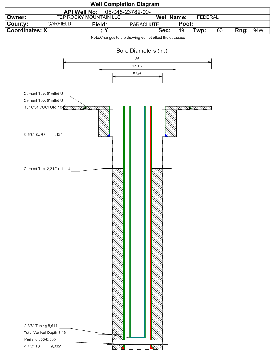 | Wellbore Completed | | Completion Date: | 9/14/2018 | | Spud Date: | 9/10/2018 | Spud Date Is: | ACTUAL | | Measured TD: | 9042 ft. | Measured PB depth: | 8997 ft. | | True Vertical TD: | 8461 ft. | True Vertical PB depth: | 8416 ft. | | Top PZ Location: | Sec:24 Twp: 6S 95W | Footage: 916 FSL 1875 FEL | | Bottom Hole Location: | Sec:24 Twp: 6S 95W | Footage: 870 FSL 1885 FEL | | Log Types: | CBL, NEU, (TRIPLE COMBO IN API 045-23764 and IN API 045-23776) | | Casing: | String Type: CONDUCTOR, Hole Size: 26 in., Size: 18 in., Top: 0 ft., Depth: 104 ft., Weight: 47.44 , Citings Type: ACTUAL | | Cement: | Sacks: 174, Top: 0 ft., Bottom: 104 ft., Determination Method: VISU | | Casing: | String Type: SURF, Hole Size: 13.5 in., Size: 9.625 in., Top: 0 ft., Depth: 1124 ft., Weight: 36 , Citings Type: ACTUAL | | Cement: | Sacks: 300, Top: 0 ft., Bottom: 1124 ft., Determination Method: VISU | | Casing: | String Type: 1ST, Hole Size: 8.75 in., Size: 4.5 in., Top: 0 ft., Depth: 9032 ft., Weight: 11.6 , Citings Type: ACTUAL | | Cement: | Sacks: 1910, Top: 2312 ft., Bottom: 9042 ft., Determination Method: CBL | | Formation | Interval Top | Log Bottom | Cored | DSTs | | WASATCH G | 2810 ft. | | | N | | WILLIAMS FORK | 5402 ft. | | | N | | MESAVERDE | 5449 ft. | | | N | | OHIO CREEK | 5449 ft. | | | N | | CAMEO | 8468 ft. | | | N | | ROLLINS | 8933 ft. | | | N |