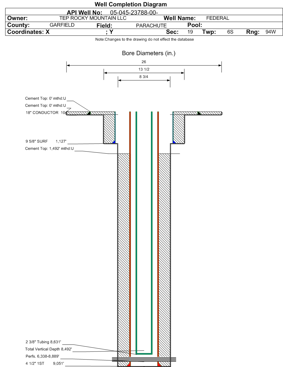 Wellbore #00 Wellbore Classification: GW Status: PR - 12/17/2018 Measured TD: 9061 ft. Vertical TD: 8492 ft.| Wellbore Data for Original Wellbore | Wellbore Classification: GW PR - 12/17/2018 | | Wellbore Permit | DIRECTIONAL | | Permit #: | | Expiration Date: | 10/19/2019 | | Proposed Top PZ Location: | Sec:24 Twp: 6S 95W | Footage: 2085 FSL 1916 FEL | | Bottom Hole Location: | Sec:24 Twp: 6S 95W | Footage: 2085 FSL 1916 FEL | | Proposed Depth/Form: | 8823 ft. | | Surface Mineral Owner Same: | No | | Mineral Owner: | FEDERAL | Surface Owner: | FEDERAL | | Unit: | | Unit Number: | | | Formation And Spacing: | Code: WMFK , Formation: WILLIAMS FORK , Order: 440-79 , Unit Acreage: , Drill Unit: | | Casing: | String Type: CONDUCTOR, Hole Size: 26 in., Size: 18 in., Top: 0 ft., Depth: 80 ft., Weight: 47.4 , Citings Type: PLANNED | | Cement: | Sacks: 134, Top: 0 ft., Bottom: 80 ft. | | Casing: | String Type: SURF, Hole Size: 13.5 in., Size: 9.625 in., Top: 0 ft., Depth: 1100 ft., Weight: 36 , Citings Type: PLANNED | | Cement: | Sacks: 266, Top: 0 ft., Bottom: 1100 ft. | | Casing: | String Type: 1ST, Hole Size: 8.75 in., Size: 4.5 in., Top: 0 ft., Depth: 9080 ft., Weight: 11.6 , Citings Type: PLANNED | | Cement: | Sacks: 1198, Top: 2556 ft., Bottom: 9080 ft. |