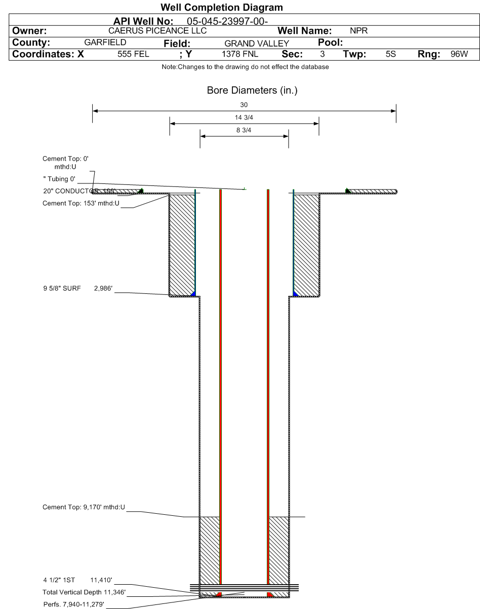 | Wellbore Completed | | Completion Date: | 1/12/2019 | | Spud Date: | 1/4/2019 | Spud Date Is: | ACTUAL | | Measured TD: | 11430 ft. | Measured PB depth: | 11408 ft. | | True Vertical TD: | 11346 ft. | True Vertical PB depth: | 11324 ft. | | Top PZ Location: | Sec:3 Twp: 5S 96W | Footage: 2268 FNL 1138 FEL | | Bottom Hole Location: | Sec:3 Twp: 5S 96W | Footage: 2339 FNL 1317 FEL | | Log Types: | CBL, Pulsed Neutron, (Triple Combo on 045-13024). | | Casing: | String Type: CONDUCTOR, Hole Size: 30 in., Size: 20 in., Top: 0 ft., Depth: 100 ft., Weight: 54 , Citings Type: ACTUAL | | Cement: | Sacks: 218, Top: 0 ft., Bottom: 100 ft., Determination Method: VISU | | Casing: | String Type: SURF, Hole Size: 14.75 in., Size: 9.625 in., Top: 0 ft., Depth: 2986 ft., Weight: 36 , Citings Type: ACTUAL | | Cement: | Sacks: 877, Top: 153 ft., Bottom: 2986 ft., Determination Method: CALC | | Casing: | String Type: 1ST, Hole Size: 8.75 in., Size: 4.5 in., Top: 0 ft., Depth: 11410 ft., Weight: 11.6 , Citings Type: ACTUAL | | Cement: | Sacks: 967, Top: 9170 ft., Bottom: 11430 ft., Determination Method: CBL | | Additional Cement: | String Type: 1ST , Top: 7626 ft., Depth: 7694 ft., Bottom: 8036 ft., Sacks: 192, Method: SQUEEZE | | Additional Cement: | String Type: SURF , Top: 0 ft., Depth: 153 ft., Bottom: 153 ft., Sacks: 200, Method: 1 INCH | | Formation | Interval Top | Log Bottom | Cored | DSTs | | GREENHORN | 0 ft. | | N | N | | WASATCH | 3145 ft. | | N | N | | WASATCH G | 5436 ft. | | N | N | | FORT UNION | 5893 ft. | | N | N | | OHIO CREEK | 7879 ft. | | N | N | | WILLIAMS FORK | 8120 ft. | | N | N | | CAMEO | 10603 ft. | | N | N | | ROLLINS | 11361 ft. | | N | N |