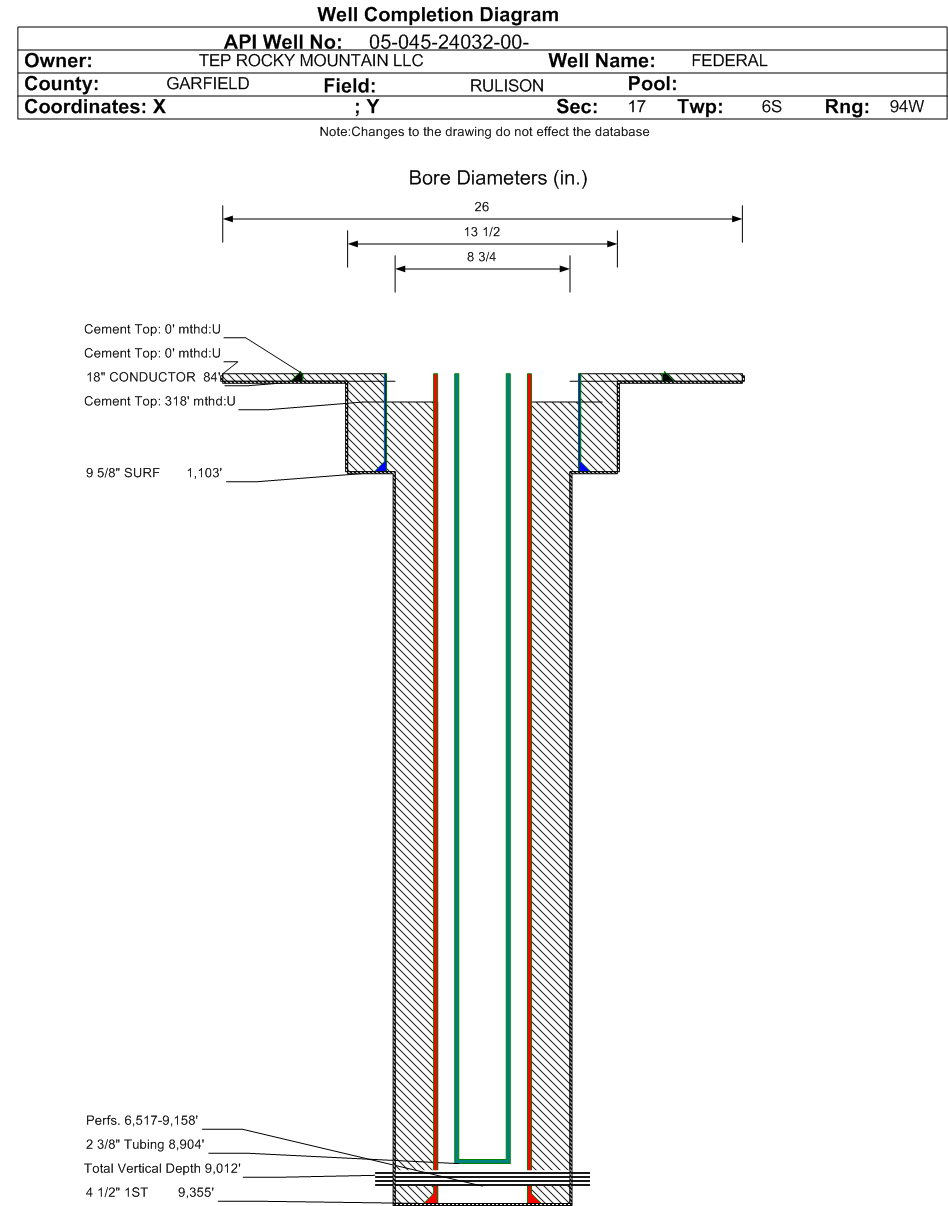 | Wellbore Completed | | Completion Date: | 7/26/2019 | | Spud Date: | 7/20/2019 | Spud Date Is: | ACTUAL | | Measured TD: | 9355 ft. | Measured PB depth: | 9324 ft. | | True Vertical TD: | 9012 ft. | True Vertical PB depth: | 8982 ft. | | Top PZ Location: | Sec:8 Twp: 6S 94W | Footage: 1380 FSL 653 FWL | | Bottom Hole Location: | Sec:8 Twp: 6S 94W | Footage: 1371 FSL 628 FWL | | Log Types: | CBL, NEU, (Triple Combo in API 045-24035) | | Casing: | String Type: CONDUCTOR, Hole Size: 26 in., Size: 18 in., Top: 0 ft., Depth: 84 ft., Weight: 47.44 , Citings Type: ACTUAL | | Cement: | Sacks: 140, Top: 0 ft., Bottom: 84 ft., Determination Method: VISU | | Casing: | String Type: SURF, Hole Size: 13.5 in., Size: 9.625 in., Top: 0 ft., Depth: 1103 ft., Weight: 36 , Citings Type: ACTUAL | | Cement: | Sacks: 300, Top: 0 ft., Bottom: 1103 ft., Determination Method: VISU | | Casing: | String Type: 1ST, Hole Size: 8.75 in., Size: 4.5 in., Top: 0 ft., Depth: 9355 ft., Weight: 11.6 , Citings Type: ACTUAL | | Cement: | Sacks: 1990, Top: 318 ft., Bottom: 9355 ft., Determination Method: CBL | | Formation | Interval Top | Log Bottom | Cored | DSTs | | WASATCH G | 2892 ft. | | | | | WASATCH | 4805 ft. | | | | | MESAVERDE | 5544 ft. | | | | | OHIO CREEK | 5544 ft. | | | | | WILLIAMS FORK | 5636 ft. | | | | | CAMEO | 8346 ft. | | | | | ROLLINS | 9220 ft. | | | |