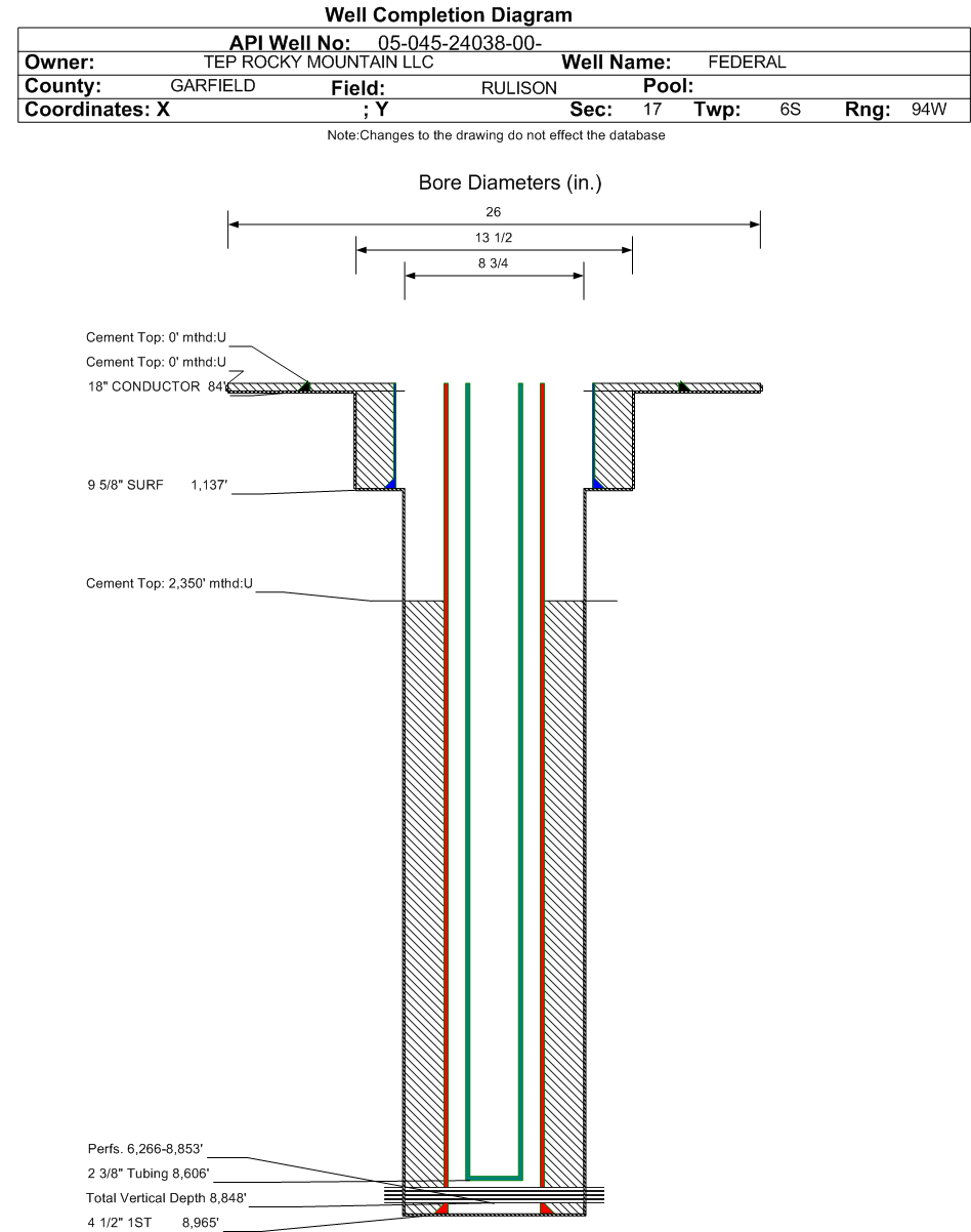 Wellbore #00 Wellbore Classification: GW Status: PR - 9/11/2019 Measured TD: 8973 ft. Vertical TD: 8848 ft.| Wellbore Data for Original Wellbore | Wellbore Classification: GW PR - 9/11/2019 | | Wellbore Permit | DIRECTIONAL | | Permit #: | | Expiration Date: | 8/30/2020 | | Proposed Top PZ Location: | Sec:17 Twp: 6S 94W | Footage: 1568 FNL 700 FWL | | Bottom Hole Location: | Sec:17 Twp: 6S 94W | Footage: 1568 FNL 700 FWL | | Proposed Depth/Form: | 9056 ft. | | Surface Mineral Owner Same: | No | | Mineral Owner: | FEDERAL | Surface Owner: | FEDERAL | | Unit: | | Unit Number: | | | Formation And Spacing: | Code: WMFK , Formation: WILLIAMS FORK , Order: 139-40 , Unit Acreage: , Drill Unit: | | Casing: | String Type: CONDUCTOR, Hole Size: 26 in., Size: 18 in., Top: 0 ft., Depth: 80 ft., Weight: 47.4 , Citings Type: PLANNED | | Cement: | Sacks: 134, Top: 0 ft., Bottom: 80 ft. | | Casing: | String Type: SURF, Hole Size: 13.5 in., Size: 9.625 in., Top: 0 ft., Depth: 1100 ft., Weight: 36 , Citings Type: PLANNED | | Cement: | Sacks: 266, Top: 0 ft., Bottom: 1100 ft. | | Casing: | String Type: 1ST, Hole Size: 8.75 in., Size: 4.5 in., Top: 0 ft., Depth: 9056 ft., Weight: 11.6 , Citings Type: PLANNED | | Cement: | Sacks: 1117, Top: 4460 ft., Bottom: 9056 ft. |
