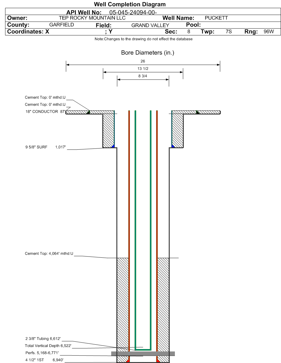 Wellbore #00 Wellbore Classification: GW Status: PR - 1/7/2020 Measured TD: 6950 ft. Vertical TD: 6522 ft.| Wellbore Data for Original Wellbore | Wellbore Classification: GW PR - 1/7/2020 | | Wellbore Permit | DIRECTIONAL | | Permit #: | | Expiration Date: | 9/17/2020 | | Proposed Top PZ Location: | Sec:8 Twp: 7S 96W | Footage: 469 FSL 1539 FWL | | Bottom Hole Location: | Sec:8 Twp: 7S 96W | Footage: 435 FSL 1530 FWL | | Proposed Depth/Form: | 6989 ft. | | Surface Mineral Owner Same: | No | | Mineral Owner: | FEE | Surface Owner: | FEE | | Unit: | | Unit Number: | | | Formation And Spacing: | Code: WMFK , Formation: WILLIAMS FORK , Order: 510-20 , Unit Acreage: , Drill Unit: | | Casing: | String Type: CONDUCTOR, Hole Size: 26 in., Size: 18 in., Top: 0 ft., Depth: 63 ft., Weight: 47.4 , Citings Type: PLANNED | | Cement: | Sacks: 105, Top: 0 ft., Bottom: 63 ft. | | Casing: | String Type: SURF, Hole Size: 13.5 in., Size: 9.625 in., Top: 0 ft., Depth: 1000 ft., Weight: 32.3 , Citings Type: PLANNED | | Cement: | Sacks: 240, Top: 0 ft., Bottom: 1000 ft. | | Casing: | String Type: 1ST, Hole Size: 8.75 in., Size: 4.5 in., Top: 0 ft., Depth: 6989 ft., Weight: 11.6 , Citings Type: PLANNED | | Cement: | Sacks: 528, Top: 3923 ft., Bottom: 6989 ft. |