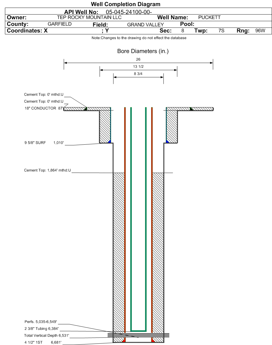 | Wellbore Completed | | Completion Date: | 10/27/2019 | | Spud Date: | 10/25/2019 | Spud Date Is: | ACTUAL | | Measured TD: | 6691 ft. | Measured PB depth: | 6651 ft. | | True Vertical TD: | 6531 ft. | True Vertical PB depth: | 6491 ft. | | Top PZ Location: | Sec:8 Twp: 7S 96W | Footage: 1368 FSL 1494 FWL | | Bottom Hole Location: | Sec:8 Twp: 7S 96W | Footage: 1327 FSL 1479 FWL | | Log Types: | CBL, NEU, (RES in API 045-24094) | | Casing: | String Type: CONDUCTOR, Hole Size: 26 in., Size: 18 in., Top: 0 ft., Depth: 87 ft., Weight: 47.44 , Citings Type: ACTUAL | | Cement: | Sacks: 105, Top: 0 ft., Bottom: 87 ft., Determination Method: VISU | | Casing: | String Type: SURF, Hole Size: 13.5 in., Size: 9.625 in., Top: 0 ft., Depth: 1010 ft., Weight: 36 , Citings Type: ACTUAL | | Cement: | Sacks: 275, Top: 0 ft., Bottom: 1010 ft., Determination Method: VISU | | Casing: | String Type: 1ST, Hole Size: 8.75 in., Size: 4.5 in., Top: 0 ft., Depth: 6681 ft., Weight: 11.6 , Citings Type: ACTUAL | | Cement: | Sacks: 805, Top: 1864 ft., Bottom: 6691 ft., Determination Method: CBL | | Formation | Interval Top | Log Bottom | Cored | DSTs | | WASATCH G | 2190 ft. | | | | | MESAVERDE | 3764 ft. | | | | | OHIO CREEK | 3764 ft. | | | | | WILLIAMS FORK | 3873 ft. | | | | | CAMEO | 6135 ft. | | | | | ROLLINS | 6619 ft. | | | |