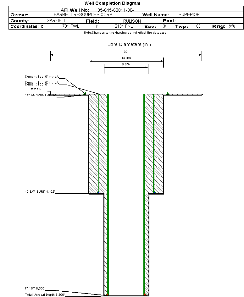 | Wellbore Completed | | Completion Date: | 3/31/1982 | | Measured TD: | 8300 ft. | Measured PB depth: | 8276 ft. | | True Vertical TD: | 8300 ft. | True Vertical PB depth: | | | Casing: | String Type: CONDUCTOR, Hole Size: 30 in., Size: 16 in., Top: 0 ft., Depth: 40 ft., Weight: , Citings Type: HISTORICAL | | Cement: | Sacks: 0, Top: 0 ft., Bottom: , Determination Method: | | Casing: | String Type: SURF, Hole Size: 14.75 in., Size: 10.75 in., Top: 0 ft., Depth: 4102 ft., Weight: , Citings Type: HISTORICAL | | Cement: | Sacks: 0, Top: 0 ft., Bottom: , Determination Method: | | Casing: | String Type: 1ST, Hole Size: 8.75 in., Size: 7 in., Top: 0 ft., Depth: 8300 ft., Weight: , Citings Type: HISTORICAL | | Cement: | Sacks: 0, Top: 0 ft., Bottom: , Determination Method: |