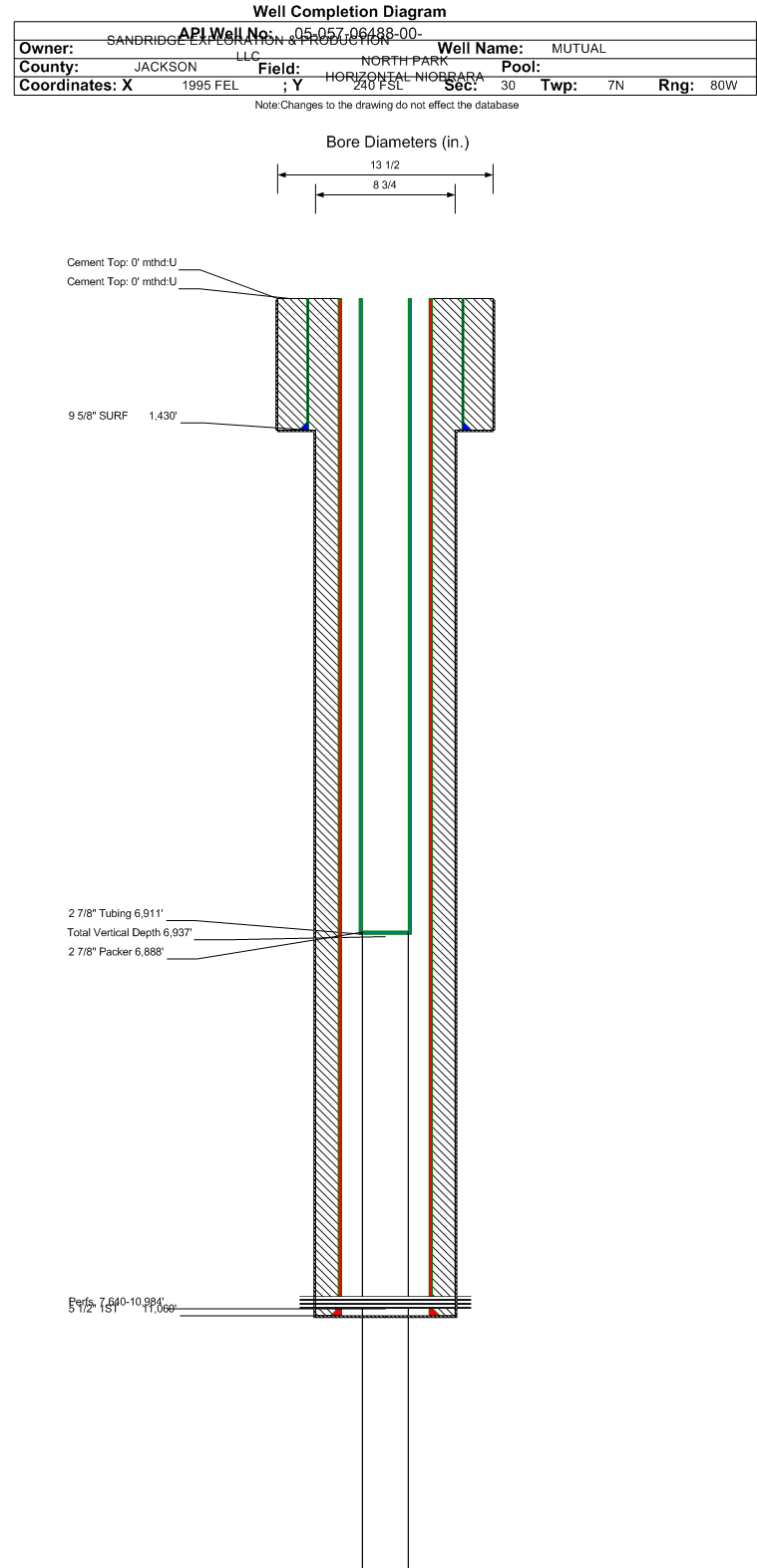 | Wellbore Completed | | Completion Date: | N/A | | Measured TD: | | Measured PB depth: | | | True Vertical TD: | | True Vertical PB depth: | | | Casing: | String Type: SURF, Hole Size: 13.5 in., Size: 9.625 in., Top: 0 ft., Depth: 1430 ft., Weight: 36 , Citings Type: ACTUAL | | Cement: | Sacks: 1010, Top: 0 ft., Bottom: 1430 ft., Determination Method: | | Casing: | String Type: 1ST, Hole Size: 8.75 in., Size: 5.5 in., Top: 0 ft., Depth: 11060 ft., Weight: 23 , Citings Type: ACTUAL | | Cement: | Sacks: 1900, Top: , Bottom: 11060 ft., Determination Method: | | No formation data to display. |
