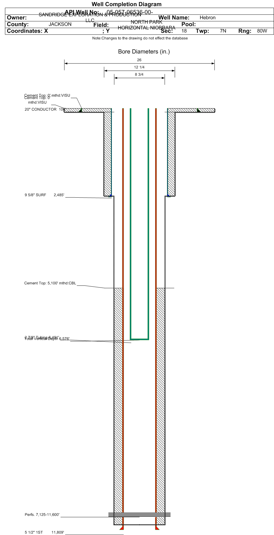 | Wellbore Completed | | Completion Date: | 3/15/2016 | | Spud Date: | 2/24/2016 | Spud Date Is: | ACTUAL | | Measured TD: | 11809 ft. | Measured PB depth: | 11715 ft. | | True Vertical TD: | 6576 ft. | True Vertical PB depth: | 6586 ft. | | Top PZ Location: | Sec:7 Twp: 7N 80W | Footage: 301 FSL 2265 FEL | | Bottom Hole Location: | Sec:7 Twp: 7N 80W | Footage: 221 FNL 2404 FEL | | Log Types: | MWD/LWD, Mud, CBL | | Casing: | String Type: CONDUCTOR, Hole Size: 26 in., Size: 20 in., Top: 0 ft., Depth: 106 ft., Weight: 94 , Citings Type: ACTUAL | | Cement: | Sacks: 190, Top: 0 ft., Bottom: 106 ft., Determination Method: VISU | | Casing: | String Type: SURF, Hole Size: 12.25 in., Size: 9.625 in., Top: 0 ft., Depth: 2485 ft., Weight: 36 , Citings Type: ACTUAL | | Cement: | Sacks: 590, Top: 0 ft., Bottom: 2485 ft., Determination Method: VISU | | Casing: | String Type: 1ST, Hole Size: 8.75 in., Size: 5.5 in., Top: 0 ft., Depth: 11809 ft., Weight: 20 , Citings Type: ACTUAL | | Cement: | Sacks: 2204, Top: 5100 ft., Bottom: 11809 ft., Determination Method: CBL | | Additional Cement: | String Type: SURF , Top: 0 ft., Depth: , Bottom: 20 ft., Sacks: 120, Method: 1 INCH | | Formation | Interval Top | Log Bottom | Cored | DSTs | | COALMONT | 0 ft. | | | | | FOX HILLS | 3302 ft. | | | | | PIERRE | 3758 ft. | | | | | SUSSEX | 4428 ft. | | | | | SHANNON | 4971 ft. | | | | | MANCOS | 6269 ft. | | | | | NIOBRARA | 6620 ft. | | | |