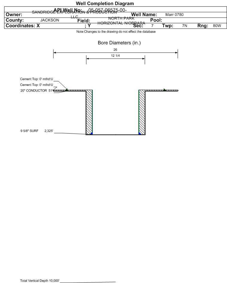 Wellbore #00 Wellbore Classification: OW Status: SO - 1/1/2021 Measured TD: 2325 ft.| Wellbore Data for Original Wellbore | Wellbore Classification: OW SO - 1/1/2021 | | Wellbore Permit | HORIZONTAL | | Permit #: | | Expiration Date: | 3/2/2021 | | Proposed Top PZ Location: | Sec:6 Twp: 7N 80W | Footage: 550 FSL 1320 FWL | | Bottom Hole Location: | Sec:31 Twp: 8N 80W | Footage: 100 FNL 1373 FWL | | Proposed Depth/Form: | 17330 ft. | | Surface Mineral Owner Same: | No | | Mineral Owner: | FEE | Surface Owner: | FEE | | Unit: | | Unit Number: | | | Formation And Spacing: | Code: NBRR , Formation: NIOBRARA , Order: 531-60 , Unit Acreage: 930, Drill Unit: S.6&31:W2,W2E2 | | Casing: | String Type: CONDUCTOR, Hole Size: 20 in., Size: 16 in., Top: 0 ft., Depth: 90 ft., Weight: 65 , Citings Type: PLANNED | | Cement: | Sacks: 63, Top: 0 ft., Bottom: 90 ft. | | Casing: | String Type: SURF, Hole Size: 12.25 in., Size: 9.625 in., Top: 0 ft., Depth: 2400 ft., Weight: 36 , Citings Type: PLANNED | | Cement: | Sacks: 630, Top: 0 ft., Bottom: 2400 ft. | | Casing: | String Type: 1ST, Hole Size: 8.75 in., Size: 5.5 in., Top: 0 ft., Depth: 17330 ft., Weight: 20 , Citings Type: PLANNED | | Cement: | Sacks: 3300, Top: , Bottom: 17330 ft. |