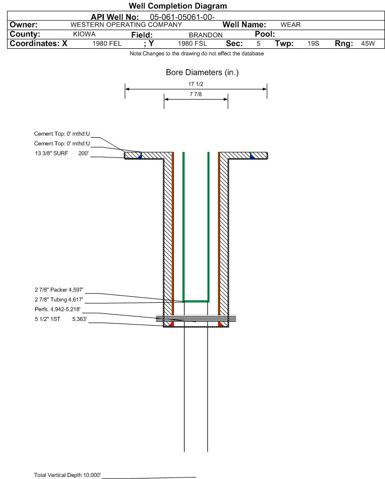 Wellbore #00 Wellbore Classification: DSPW Status: IJ - 6/12/2024 Measured TD: 5303 ft. Vertical TD: 0 ft.| Wellbore Data for Original Wellbore | Wellbore Classification: DSPW IJ - 6/12/2024 | | Wellbore Permit | | | Permit #: | 19600000 | Expiration Date: | 10/24/1961 | | Proposed Depth/Form: | 5250 ft. | | Surface Mineral Owner Same: | Not available | | Mineral Owner: | FEE | Surface Owner: | Not available | | Unit: | | Unit Number: | | | Formation And Spacing: | Code: MSSP , Formation: MISSISSIPPIAN , Order: 0 , Unit Acreage: 0, Drill Unit: |