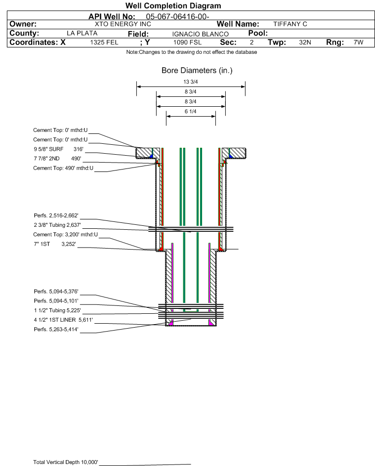 | Wellbore Completed | | Completion Date: | 12/26/2000 | | Spud Date: | 7/18/1980 | Spud Date Is: | ACTUAL | | Measured TD: | 5611 ft. | Measured PB depth: | 5535 ft. | | True Vertical TD: | | True Vertical PB depth: | | | Log Types: | | | Log Types: | GR-IND,SNP-FDC-GR | | Casing: | String Type: SURF, Hole Size: 13.75 in., Size: 9.625 in., Top: 0 ft., Depth: 316 ft., Weight: 36 , Citings Type: ACTUAL | | Cement: | Sacks: 280, Top: 0 ft., Bottom: 316 ft., Determination Method: | | Casing: | String Type: 1ST, Hole Size: 8.75 in., Size: 7 in., Top: 0 ft., Depth: 3252 ft., Weight: , Citings Type: ACTUAL | | Cement: | Sacks: 590, Top: 490 ft., Bottom: 3252 ft., Determination Method: CBL | | Casing: | String Type: 2ND, Hole Size: 8.75 in., Size: 7.875 in., Top: 590 ft., Depth: 490 ft., Weight: 3252 , Citings Type: ACTUAL | | Cement: | Sacks: 3252, Top: , Bottom: , Determination Method: CALC | | Casing: | String Type: 1ST LINER, Hole Size: 6.25 in., Size: 4.5 in., Top: 3009 ft., Depth: 5611 ft., Weight: 10.5 , Citings Type: ACTUAL | | Cement: | Sacks: 425, Top: 3200 ft., Bottom: 5611 ft., Determination Method: CALC | | Formation | Interval Top | Log Bottom | Cored | DSTs | | OJO ALAMO | 1532 ft. | | N | N | | FRUITLAND COAL | 2670 ft. | | N | N | | PICTURED CLIFFS | 2854 ft. | | N | N | | MESAVERDE | 4835 ft. | | N | N | | MENEFEE | 5057 ft. | | N | N | | POINT LOOKOUT | 5262 ft. | | N | N | | MANCOS | 5386 ft. | | N | N |