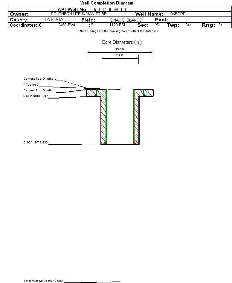 | Wellbore Completed | | Completion Date: | 5/15/2001 | | Spud Date: | 4/12/2001 | Spud Date Is: | ACTUAL | | Measured TD: | 3031 ft. | Measured PB depth: | 3024 ft. | | True Vertical TD: | | True Vertical PB depth: | | | Log Types: | CBL,DENSITY/NETRON | | Casing: | String Type: SURF, Hole Size: 13.75 in., Size: 9.625 in., Top: , Depth: 348 ft., Weight: 36 , Citings Type: ACTUAL | | Cement: | Sacks: 360, Top: , Bottom: , Determination Method: | | Casing: | String Type: 1ST, Hole Size: 7.875 in., Size: 5.5 in., Top: , Depth: 2833 ft., Weight: 15.5 , Citings Type: ACTUAL | | Cement: | Sacks: 477, Top: , Bottom: , Determination Method: | | Formation | Interval Top | Log Bottom | Cored | DSTs | | FRUITLAND COAL | 2689 ft. | 2810 ft. | N | N | | FRUITLAND | 2826 ft. | 2934 ft. | N | N |