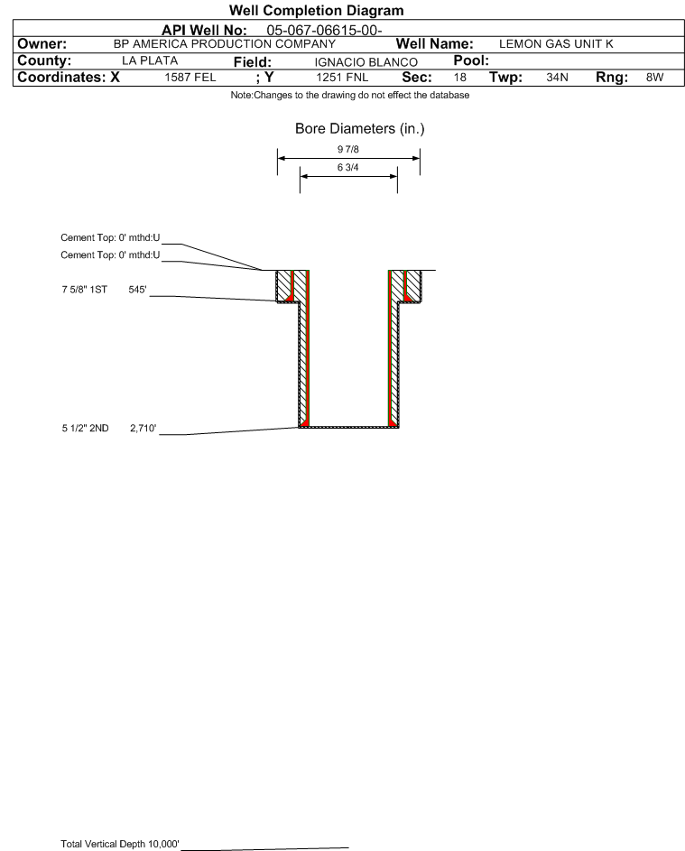 | Wellbore Completed | | Completion Date: | 2/5/1986 | | Spud Date: | 9/4/1982 | Spud Date Is: | ACTUAL | | Measured TD: | 2710 ft. | Measured PB depth: | 2442 ft. | | True Vertical TD: | 0 ft. | True Vertical PB depth: | | | Casing: | String Type: 1ST, Hole Size: 9.875 in., Size: 7.625 in., Top: 0 ft., Depth: 545 ft., Weight: , Citings Type: HISTORICAL | | Cement: | Sacks: 200, Top: 0 ft., Bottom: , Determination Method: | | Casing: | String Type: 2ND, Hole Size: 6.75 in., Size: 5.5 in., Top: 0 ft., Depth: 2710 ft., Weight: , Citings Type: HISTORICAL | | Cement: | Sacks: 0, Top: 0 ft., Bottom: , Determination Method: | | Formation | Interval Top | Log Bottom | Cored | DSTs | | FRUITLAND | 2203 ft. | | | | | PICTURED CLIFFS | 2486 ft. | | | |