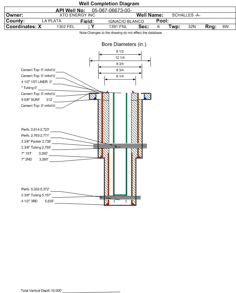 | Wellbore Completed | | Completion Date: | 11/21/2002 | | Spud Date: | 10/29/2002 | Spud Date Is: | ACTUAL | | Measured TD: | 5635 ft. | Measured PB depth: | 5339 ft. | | True Vertical TD: | | True Vertical PB depth: | | | Log Types: | CBL / GR | | Log Types: | SP-DIL-GR,CNL-CDL-GR | | Casing: | String Type: SURF, Hole Size: 12.25 in., Size: 9.625 in., Top: 0 ft., Depth: 312 ft., Weight: 36 , Citings Type: ACTUAL | | Cement: | Sacks: 150, Top: 0 ft., Bottom: 312 ft., Determination Method: VISU | | Casing: | String Type: 1ST, Hole Size: 8.75 in., Size: 7 in., Top: 0 ft., Depth: 3260 ft., Weight: 20 , Citings Type: ACTUAL | | Cement: | Sacks: 100, Top: 380 ft., Bottom: 3260 ft., Determination Method: CALC | | Casing: | String Type: 1ST LINER, Hole Size: 6.25 in., Size: 4.5 in., Top: 3013 ft., Depth: 5635 ft., Weight: 10.5 , Citings Type: ACTUAL | | Cement: | Sacks: 200, Top: 3910 ft., Bottom: 5635 ft., Determination Method: CALC | | Formation | Interval Top | Log Bottom | Cored | DSTs | | OJO ALAMO | 1604 ft. | | | | | KIRTLAND | 1844 ft. | | | | | FRUITLAND COAL | 2614 ft. | 2723 ft. | N | N | | FRUITLAND | 2763 ft. | 2771 ft. | N | N | | PICTURED CLIFFS | 2784 ft. | | | | | LEWIS | 3074 ft. | | | | | MESAVERDE | 4787 ft. | | | | | MENEFEE | 5174 ft. | | | | | POINT LOOKOUT | 5370 ft. | | | | | MANCOS | 5532 ft. | | | |