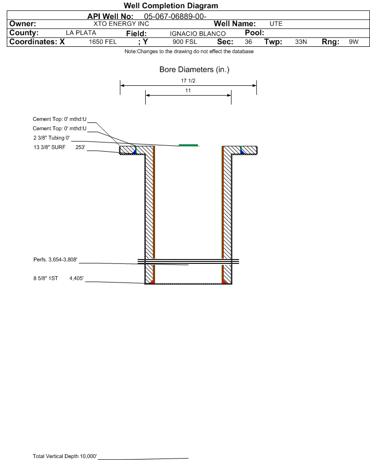 Wellbore #00 Wellbore Classification: CBM Status: PR - 10/2/2003 Measured TD: 8702 ft. Vertical TD: 0 ft.| Wellbore Data for Original Wellbore | Wellbore Classification: CBM PR - 10/2/2003 | | Wellbore Permit | | | Permit #: | 20031994 | Expiration Date: | 10/6/2004 | | Proposed Depth/Form: | 8702 ft. | | Surface Mineral Owner Same: | Yes | | Mineral Owner: | INDIAN | Surface Owner: | INDIAN | | Unit: | | Unit Number: | | | Formation And Spacing: | Code: DKTA , Formation: DAKOTA , Order: 0 , Unit Acreage: 0, Drill Unit: | | Formation And Spacing: | Code: FRLDC , Formation: FRUITLAND COAL , Order: 112-136 , Unit Acreage: , Drill Unit: | | Casing: | String Type: SURF, Hole Size: 17.5 in., Size: 13.375 in., Top: , Depth: 253 ft., Weight: 61 , Citings Type: PLANNED | | Cement: | Sacks: 300, Top: , Bottom: | | Casing: | String Type: 1ST, Hole Size: 11 in., Size: 8.625 in., Top: , Depth: 4405 ft., Weight: 32 , Citings Type: PLANNED | | Cement: | Sacks: 410, Top: , Bottom: | | Casing: | String Type: 2ND, Hole Size: , Size: 5.5 in., Top: , Depth: 8702 ft., Weight: 24 , Citings Type: PLANNED | | Cement: | Sacks: 700, Top: , Bottom: | | Casing: | String Type: 3RD, Hole Size: , Size: 2.375 in., Top: , Depth: 3803 ft., Weight: 4.7 , Citings Type: PLANNED | | Cement: | Sacks: , Top: , Bottom: |
