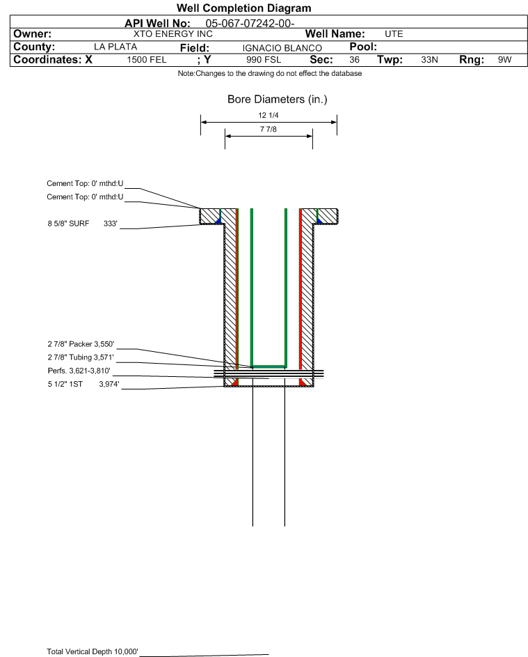 | | Tubing Size: | 2.875 in. | Tubing Setting Depth: | 3571 ft. | | Tubing Packer Depth: | 3570 ft. | Tubing Multiple Packer: | | | Open Hole Top: | | Open Hole Bottom: | | | No Initial Test Data was found for formation FRLDC. |