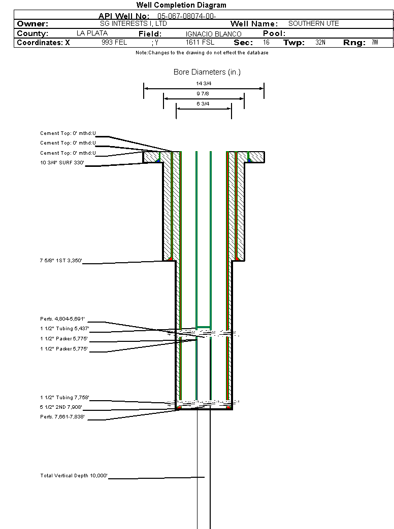 | Wellbore Completed | | Completion Date: | 2/23/1997 | | Spud Date: | 12/3/1996 | Spud Date Is: | ACTUAL | | Measured TD: | 7908 ft. | Measured PB depth: | 7878 ft. | | True Vertical TD: | | True Vertical PB depth: | | | Log Types: | CNL/FDC/GR, GR/TDT; GR/CBL/CCL; IND. | | Casing: | String Type: CONDUCTOR, Hole Size: 14.75 in., Size: 10.75 in., Top: 0 ft., Depth: 330 ft., Weight: 40.5 , Citings Type: ACTUAL | | Cement: | Sacks: 400, Top: 0 ft., Bottom: 330 ft., Determination Method: VISU | | Casing: | String Type: SURF, Hole Size: 9.875 in., Size: 7.625 in., Top: , Depth: 3350 ft., Weight: 26.4 , Citings Type: ACTUAL | | Cement: | Sacks: 750, Top: 0 ft., Bottom: 3350 ft., Determination Method: | | Casing: | String Type: 1ST, Hole Size: 6.75 in., Size: 5.5 in., Top: , Depth: 7908 ft., Weight: 17 , Citings Type: ACTUAL | | Cement: | Sacks: 380, Top: 4550 ft., Bottom: 7908 ft., Determination Method: | | Casing: | String Type: 2ND, Hole Size: 6.75 in., Size: 5.5 in., Top: , Depth: 7908 ft., Weight: 17 , Citings Type: ACTUAL | | Cement: | Sacks: 380, Top: , Bottom: , Determination Method: | | Formation | Interval Top | Log Bottom | Cored | DSTs | | CLIFF HOUSE | 5132 ft. | | | | | MENEFEE | 5169 ft. | | | | | POINT LOOKOUT | 5418 ft. | | | | | DAKOTA | 7667 ft. | | | |