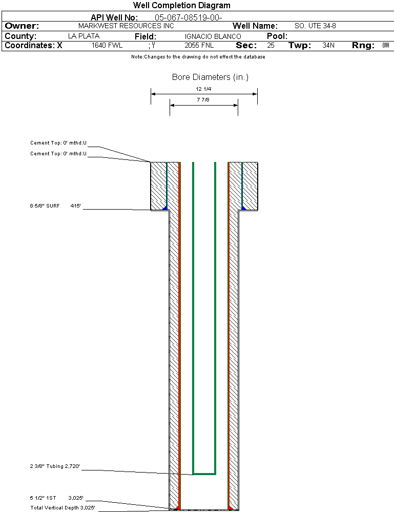 | Wellbore Completed | | Completion Date: | 11/3/2001 | | Spud Date: | 10/8/2001 | Spud Date Is: | ACTUAL | | Measured TD: | 3025 ft. | Measured PB depth: | 2983 ft. | | True Vertical TD: | | True Vertical PB depth: | | | Log Types: | CNL | | Casing: | String Type: SURF, Hole Size: 12.25 in., Size: 8.625 in., Top: 0 ft., Depth: 415 ft., Weight: 24 , Citings Type: ACTUAL | | Cement: | Sacks: 280, Top: 0 ft., Bottom: , Determination Method: | | Casing: | String Type: 1ST, Hole Size: 7.875 in., Size: 5.5 in., Top: 0 ft., Depth: 3025 ft., Weight: 15.5 , Citings Type: ACTUAL | | Cement: | Sacks: 560, Top: 0 ft., Bottom: , Determination Method: CBL | | Formation | Interval Top | Log Bottom | Cored | DSTs | | FRUITLAND COAL | 2622 ft. | 2722 ft. | N | N |