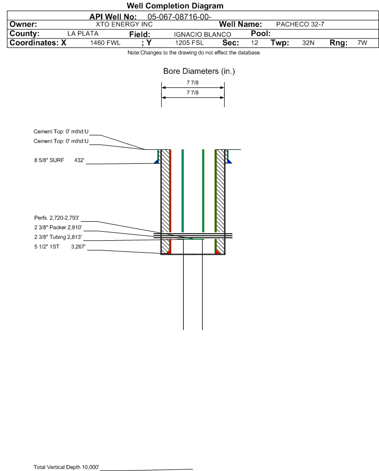 | Wellbore Completed | | Completion Date: | 7/24/2002 | | Spud Date: | 5/25/2002 | Spud Date Is: | ACTUAL | | Measured TD: | 3260 ft. | Measured PB depth: | 3216 ft. | | True Vertical TD: | | True Vertical PB depth: | | | Top PZ Location: | Sec: Twp: | Footage: FL FL | | Bottom Hole Location: | Sec: Twp: | Footage: FL FL | | Log Types: | GR / INDUCTION / NEUTRON DENSITY | | Casing: | String Type: SURF, Hole Size: 12.25 in., Size: 8.625 in., Top: 0 ft., Depth: 432 ft., Weight: 24 , Citings Type: ACTUAL | | Cement: | Sacks: 280, Top: 0 ft., Bottom: 432 ft., Determination Method: VISU | | Casing: | String Type: 1ST, Hole Size: 7.875 in., Size: 5.5 in., Top: 0 ft., Depth: 3260 ft., Weight: 17 , Citings Type: ACTUAL | | Cement: | Sacks: 524, Top: 0 ft., Bottom: 3260 ft., Determination Method: VISU | | Formation | Interval Top | Log Bottom | Cored | DSTs | | FRUITLAND COAL | 2718 ft. | 2801 ft. | N | N |