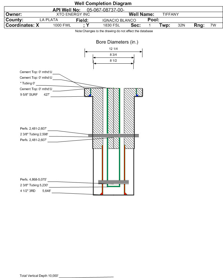 | Wellbore Completed | | Completion Date: | 9/6/2002 | | Spud Date: | 7/26/2002 | Spud Date Is: | ACTUAL | | Measured TD: | 5648 ft. | Measured PB depth: | 5575 ft. | | True Vertical TD: | | True Vertical PB depth: | | | Top PZ Location: | Sec: Twp: | Footage: FL FL | | Bottom Hole Location: | Sec: Twp: | Footage: FL FL | | Log Types: | TRIPLE COMBO | | Casing: | String Type: SURF, Hole Size: 12.25 in., Size: 9.625 in., Top: 0 ft., Depth: 427 ft., Weight: 32.3 , Citings Type: ACTUAL | | Cement: | Sacks: 589, Top: 0 ft., Bottom: 427 ft., Determination Method: | | Casing: | String Type: 2ND, Hole Size: 8.75 in., Size: , Top: 0 ft., Depth: 3200 ft., Weight: 23 , Citings Type: ACTUAL | | Cement: | Sacks: 280, Top: 0 ft., Bottom: 3200 ft., Determination Method: | | Casing: | String Type: 3RD, Hole Size: , Size: 4.5 in., Top: 3016 ft., Depth: 5648 ft., Weight: 11.6 , Citings Type: ACTUAL | | Cement: | Sacks: 280, Top: , Bottom: , Determination Method: | | Formation | Interval Top | Log Bottom | Cored | DSTs | | FRUITLAND | 2481 ft. | 2607 ft. | N | N | | FRUITLAND COAL | 2622 ft. | 2632 ft. | N | N | | MENEFEE | 4868 ft. | 5075 ft. | N | N | | POINT LOOKOUT | 5202 ft. | 5451 ft. | N | N |