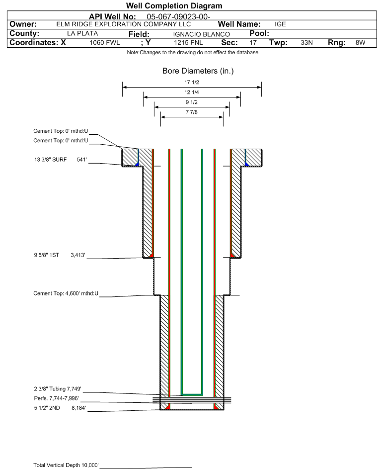 | Wellbore Completed | | Completion Date: | 10/2/2005 | | Spud Date: | 8/7/2005 | Spud Date Is: | ACTUAL | | Measured TD: | 8195 ft. | Measured PB depth: | | | True Vertical TD: | | True Vertical PB depth: | | | Log Types: | HIGH RESOLUTION INDUCTION LOG & SPECTRAL DENSITY EPITHERMAL NEUTRON | | Casing: | String Type: SURF, Hole Size: 17.5 in., Size: 13.375 in., Top: , Depth: 541 ft., Weight: 48 , Citings Type: ACTUAL | | Cement: | Sacks: 620, Top: 0 ft., Bottom: 541 ft., Determination Method: VISU | | Casing: | String Type: 1ST, Hole Size: 12.25 in., Size: 9.625 in., Top: 0 ft., Depth: 3413 ft., Weight: 32 , Citings Type: ACTUAL | | Cement: | Sacks: 1250, Top: 0 ft., Bottom: 3413 ft., Determination Method: VISU | | Casing: | String Type: 2ND, Hole Size: 7.875 in., Size: 5.5 in., Top: , Depth: 8184 ft., Weight: 17 , Citings Type: ACTUAL | | Cement: | Sacks: 693, Top: 4600 ft., Bottom: 8184 ft., Determination Method: CALC | | Casing: | String Type: STAGE TOOL, Hole Size: , Size: 5.5 in., Top: , Depth: 4585 ft., Weight: , Citings Type: ACTUAL | | Cement: | Sacks: 682, Top: 0 ft., Bottom: 4585 ft., Determination Method: CALC | | Formation | Interval Top | Log Bottom | Cored | DSTs | | FRUITLAND COAL | 2643 ft. | 2926 ft. | N | N | | PICTURED CLIFFS | 2927 ft. | 3349 ft. | N | N | | CLIFF HOUSE | 4812 ft. | 5243 ft. | N | N | | MENEFEE | 5244 ft. | 5440 ft. | N | N | | POINT LOOKOUT | 5441 ft. | 5592 ft. | N | N | | DAKOTA | 7709 ft. | | N | N |