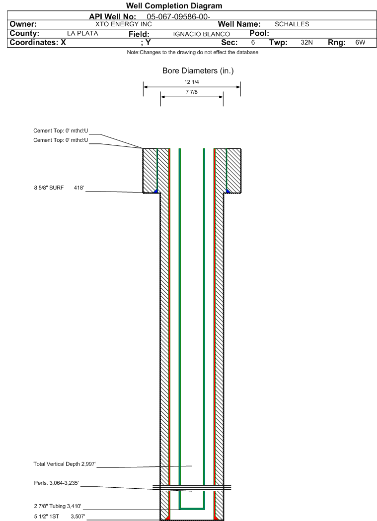 Wellbore #00 Wellbore Classification: CBM Status: PR - 1/14/2009 Measured TD: 3507 ft. Vertical TD: 2997 ft.| Wellbore Data for Original Wellbore | Wellbore Classification: CBM PR - 1/14/2009 | | Wellbore Permit | DIRECTIONAL | | Permit #: | 20083499 | Expiration Date: | 7/6/2009 | | Proposed Top PZ Location: | Sec:6 Twp: 32N 6W | Footage: 797 FNL 2079 FWL | | Bottom Hole Location: | Sec:6 Twp: 32N 6W | Footage: 797 FNL 2079 FWL | | Proposed Depth/Form: | 3499 ft. | | Surface Mineral Owner Same: | No | | Mineral Owner: | FEE | Surface Owner: | FEE | | Unit: | | Unit Number: | | | Formation And Spacing: | Code: FRLDC , Formation: FRUITLAND COAL , Order: 112-185 , Unit Acreage: 320, Drill Unit: N/2 |